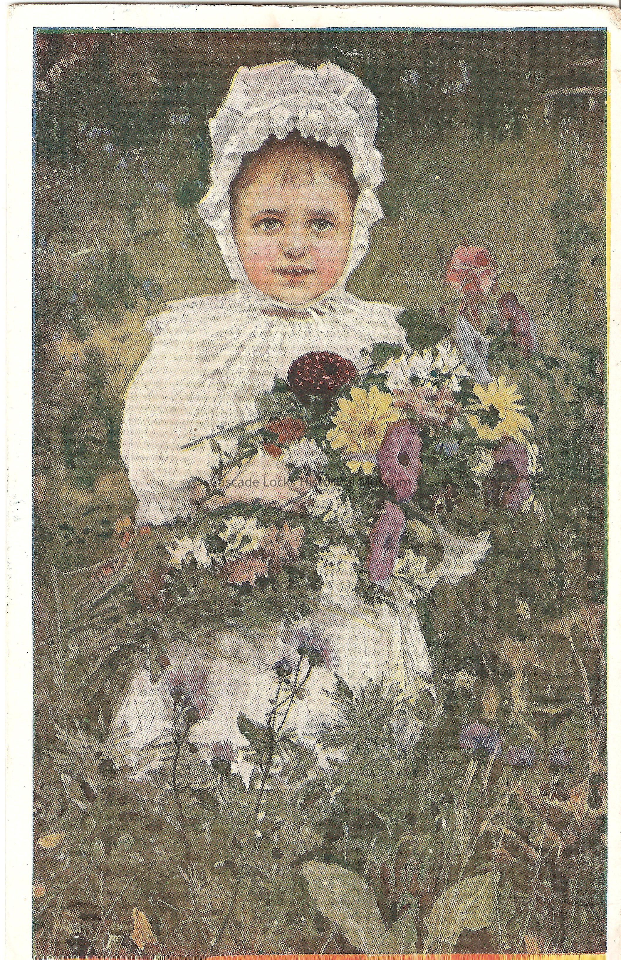 Post Card, illustrated image of a young girl in a white dress and bonnet holding a bouquet of flowers.