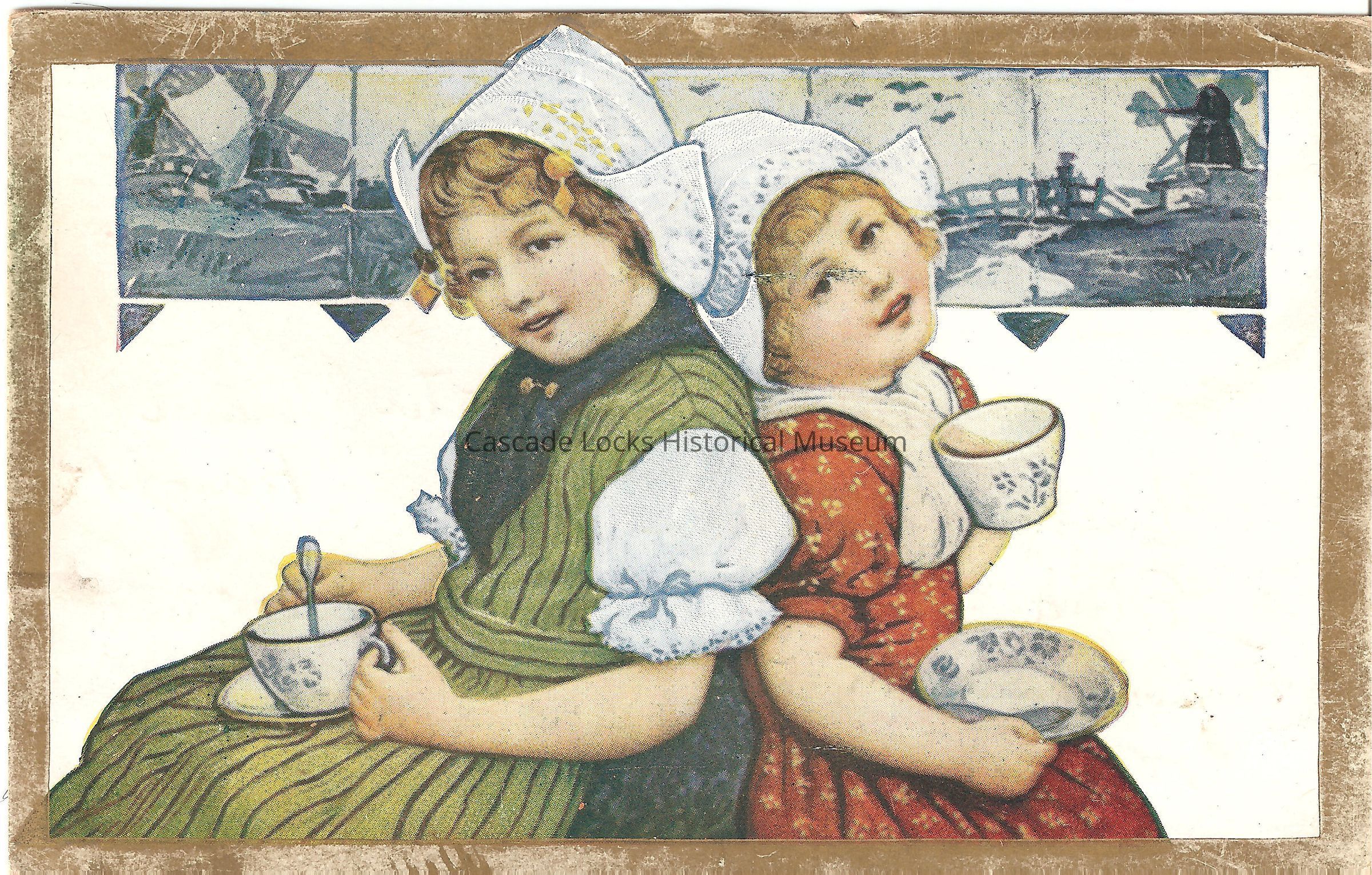 Post Card, illustrated image of two girls in traditional Dutch hats siting back to back and drinking out of tea cups. In the background is a scene of a landscape with windmills.