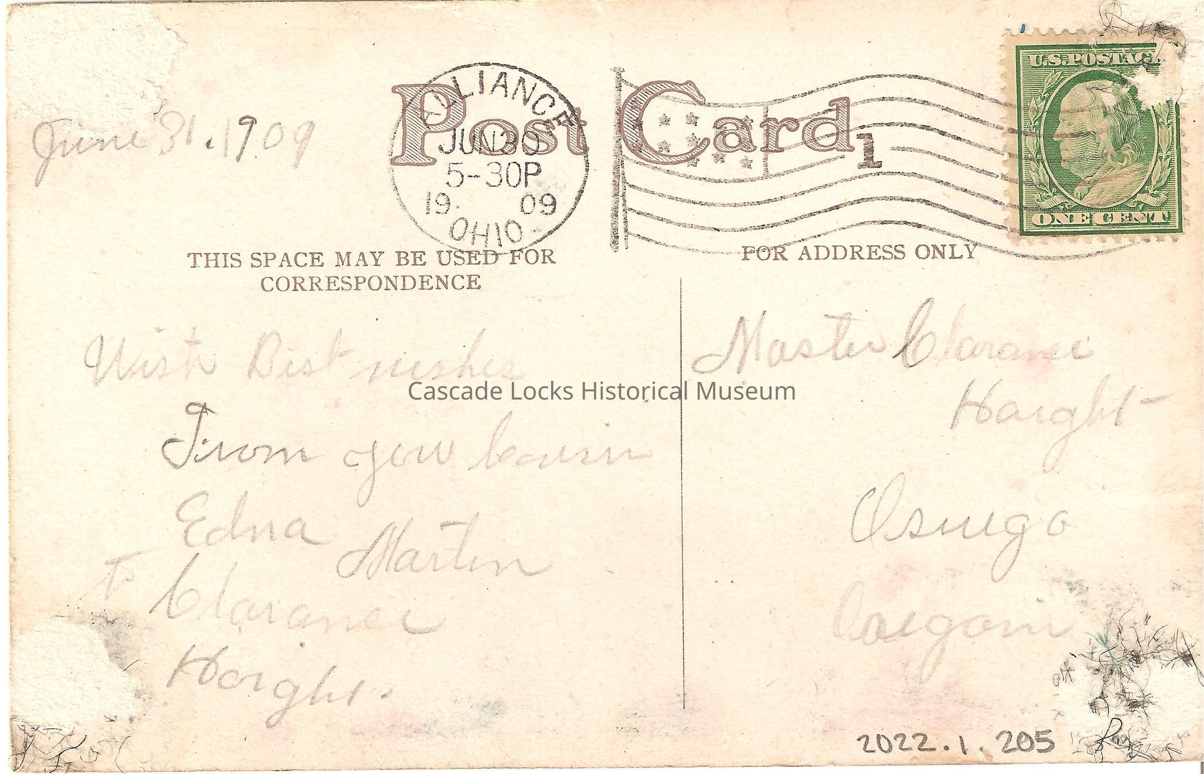 Back of image reads, "Post Card- For Correspondence- June 31, 1909. With best wishes from your cousin Edna Mailin to Clarence Haight . For Address Only- Master Arthur Haight, Oswego, Oregon. Alliance, Ohio. June 30, 5-30 PM, 1909. U.S. Postage, One Cent."Lexicon