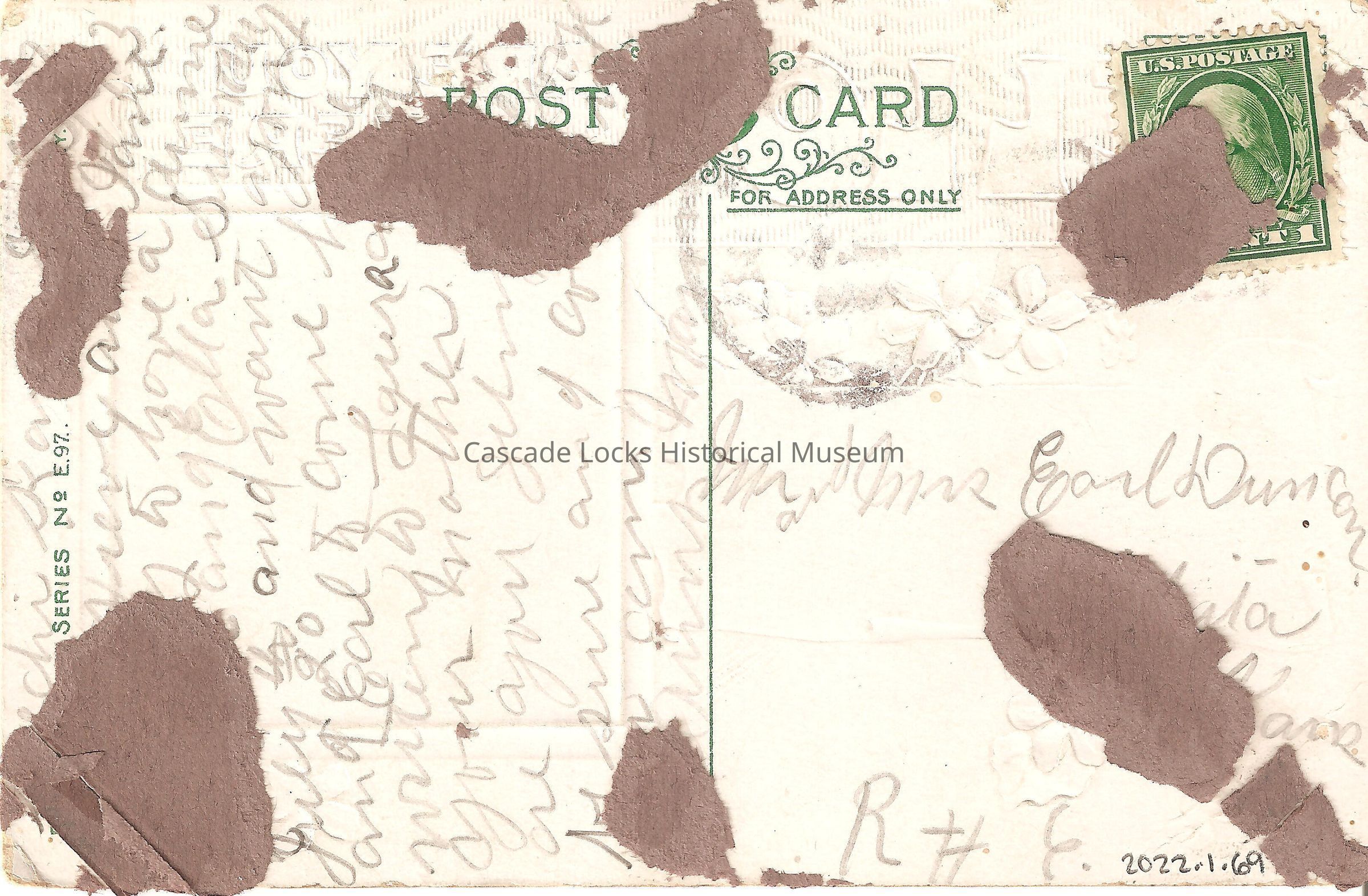 Back of image reads, "Post Card. For Address Only, U.S. Postage, One Cent." Inscription is difficult to make out because of the adhesive residue and crooked handwriting.Lexicon