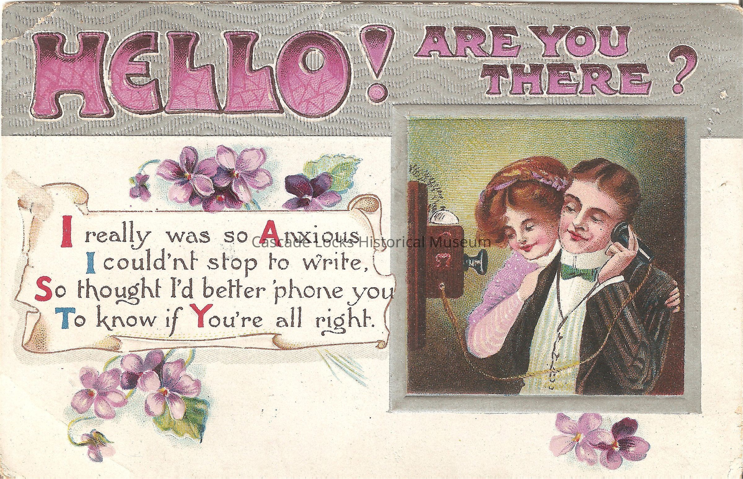 Postcard, illustration of a couple on the telephone. Card reads, "Hello! Are you there? I really was so Anxious, I couldn't stop to write, So thought I'd better 'phone you, To know if You're all right."