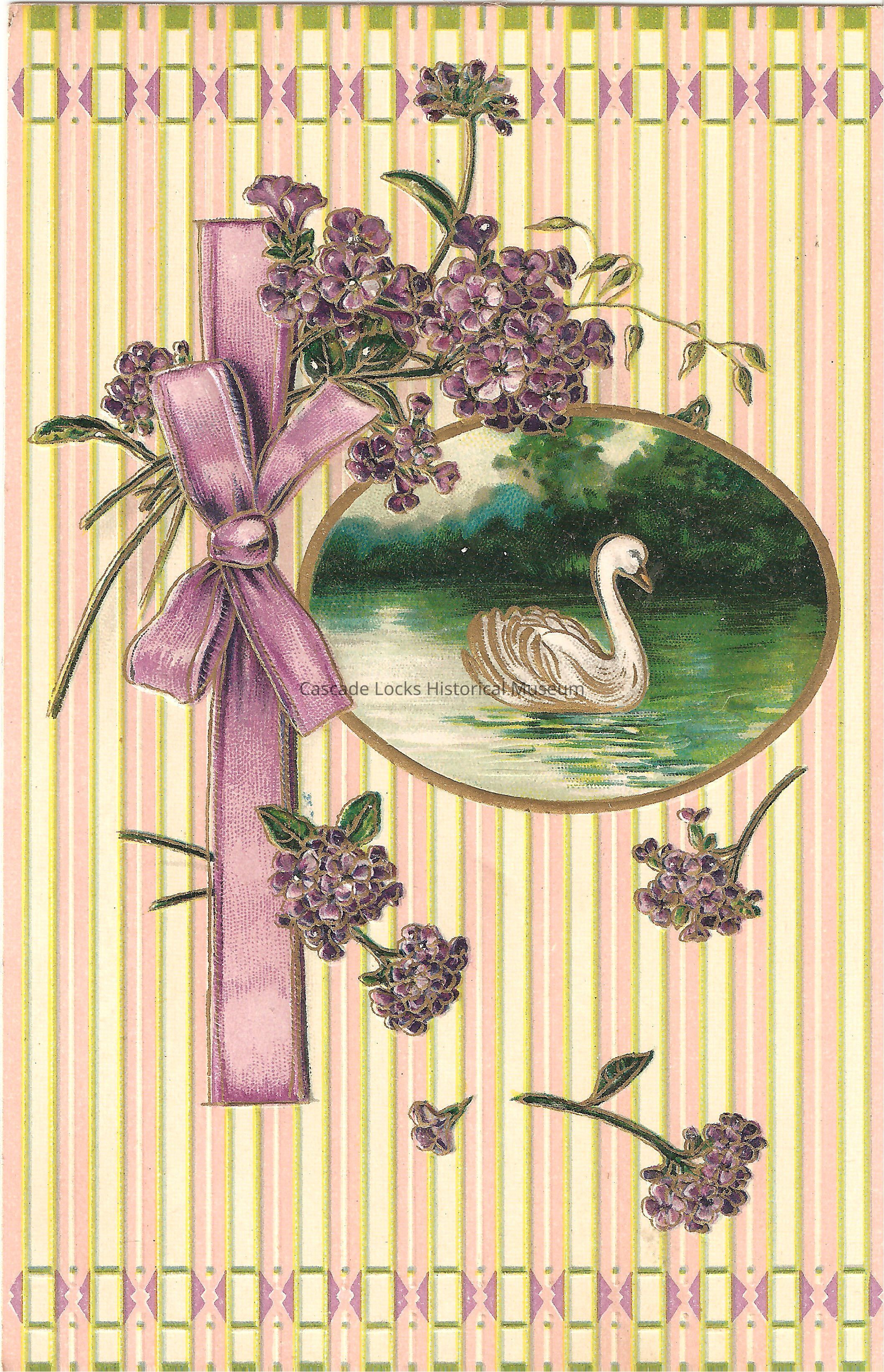 Post Card, illustrated image of two swans swimming on a body of water in a window portrait. The card is striped pink, green, and light green with purple decoration. There is a purple ribbon with purple flowers around the portrait window.