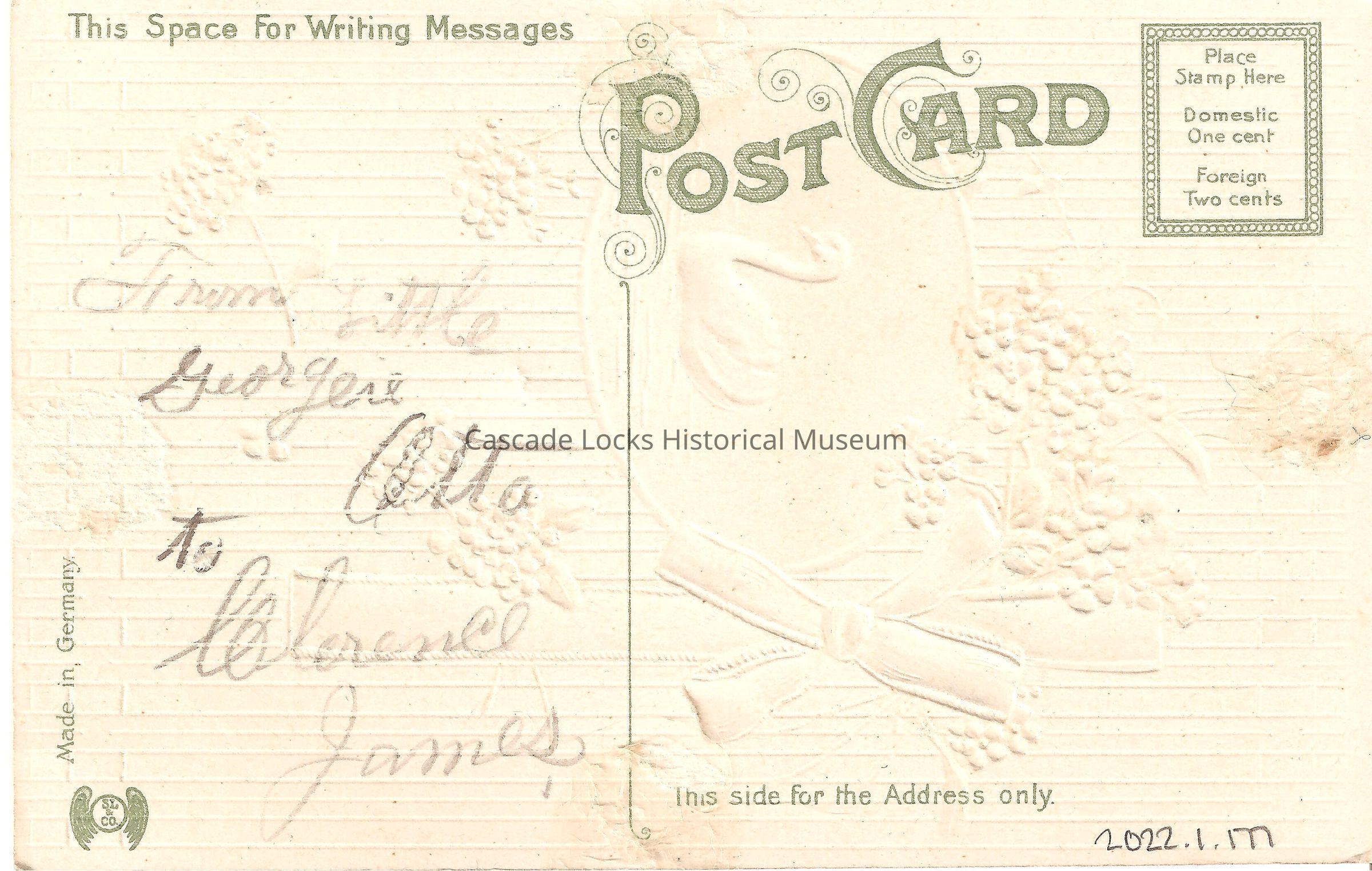 Back of image reads, "Post Card, This Space For Writing Messages- From little Georgeie Otto to Clarence James. This Side For The Address Only. Made in Germany. SL&Co. Place Stamp Here, Domestic One Cent, Foreign Two Cents."Lexicon