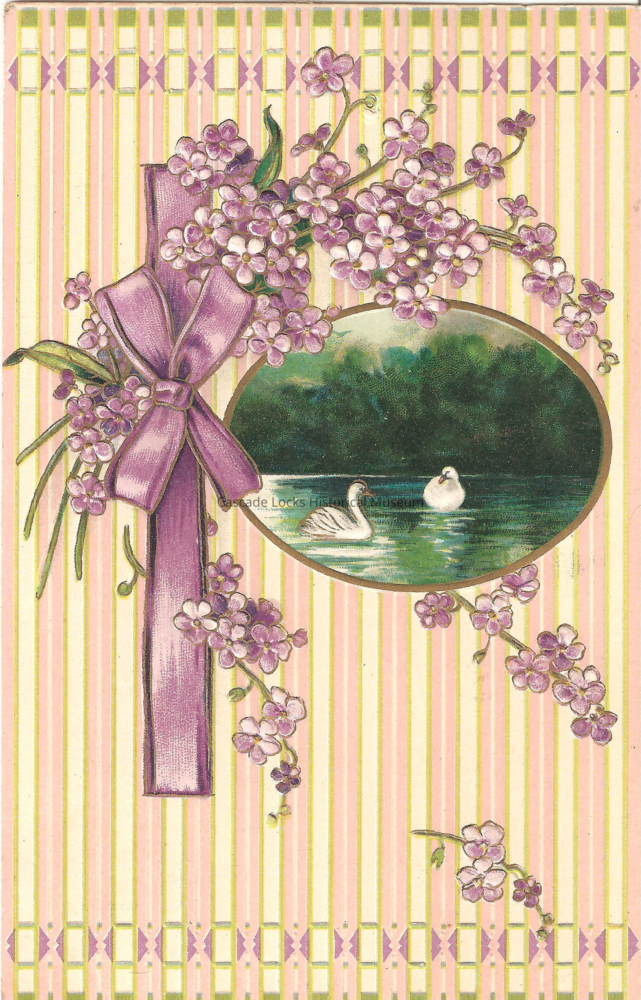 Post Card, illustrated image of two swans swimming on a body of water in a window portrait. The card is striped pink, green, and light green with purple decoration. There is a purple ribbon with purple flowers around the portrait window.
