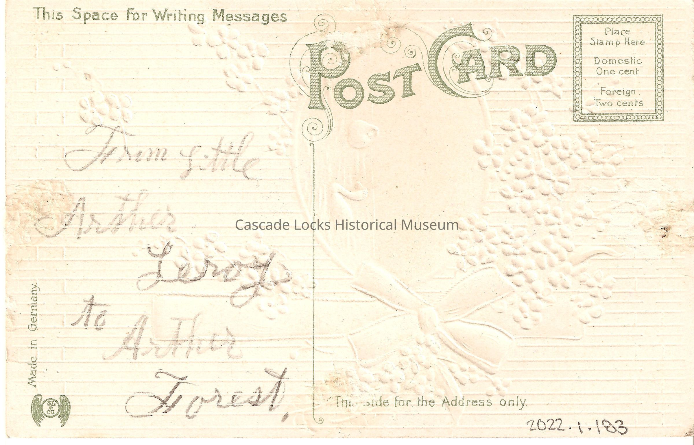 Back of image reads, "Post Card, This Space For Writing Messages- From little Arthur Leroy to Arthur Forest. This Side For The Address Only. Made in Germany. SL&Co. Place Stamp Here, Domestic One Cent, Foreign Two Cents."Lexicon