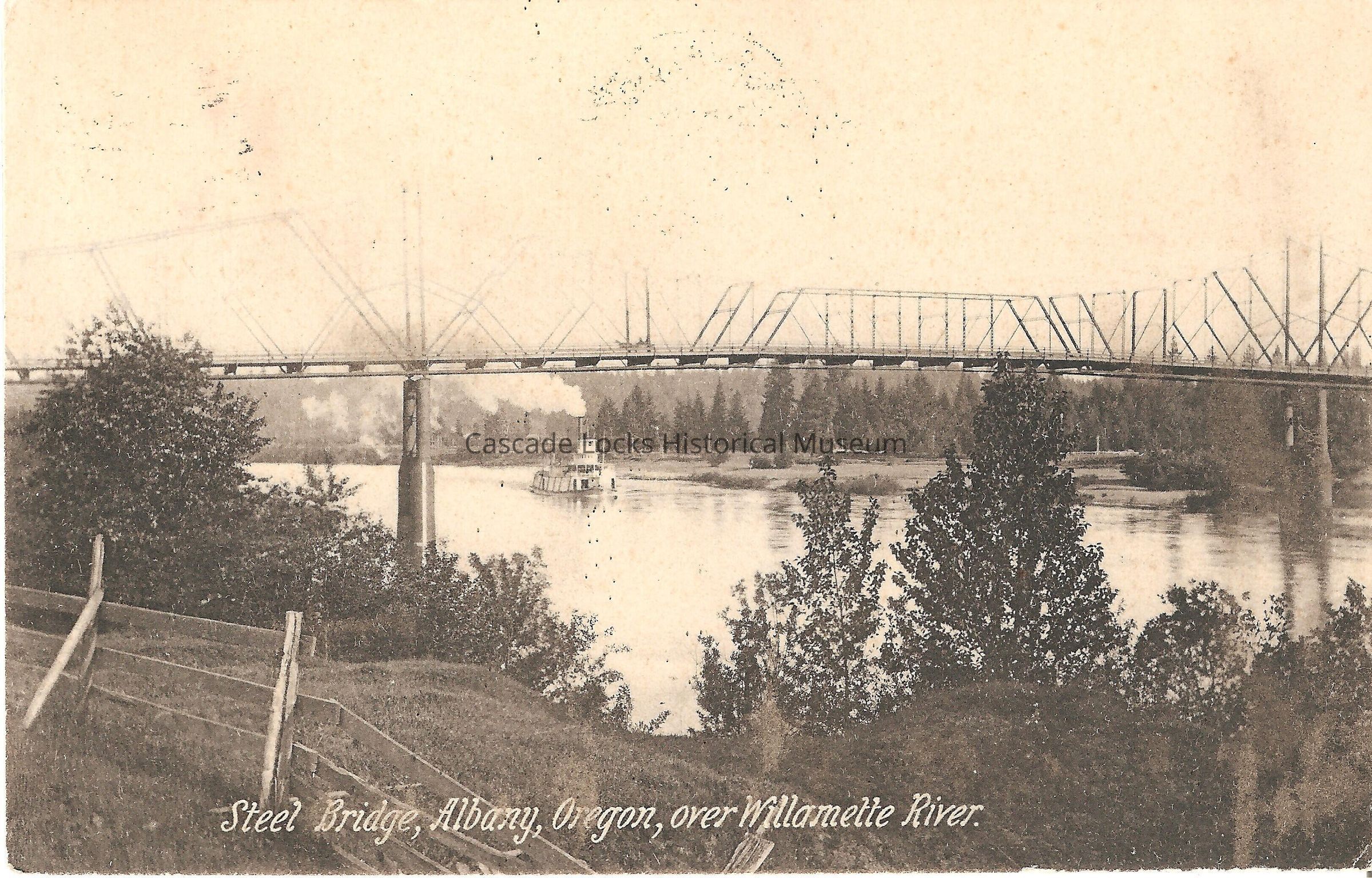 Postcard, image of a steel bridge in Albany, Oregon. Card reads, "Steel Bridge, Albany, Oregon, over Willamette River."