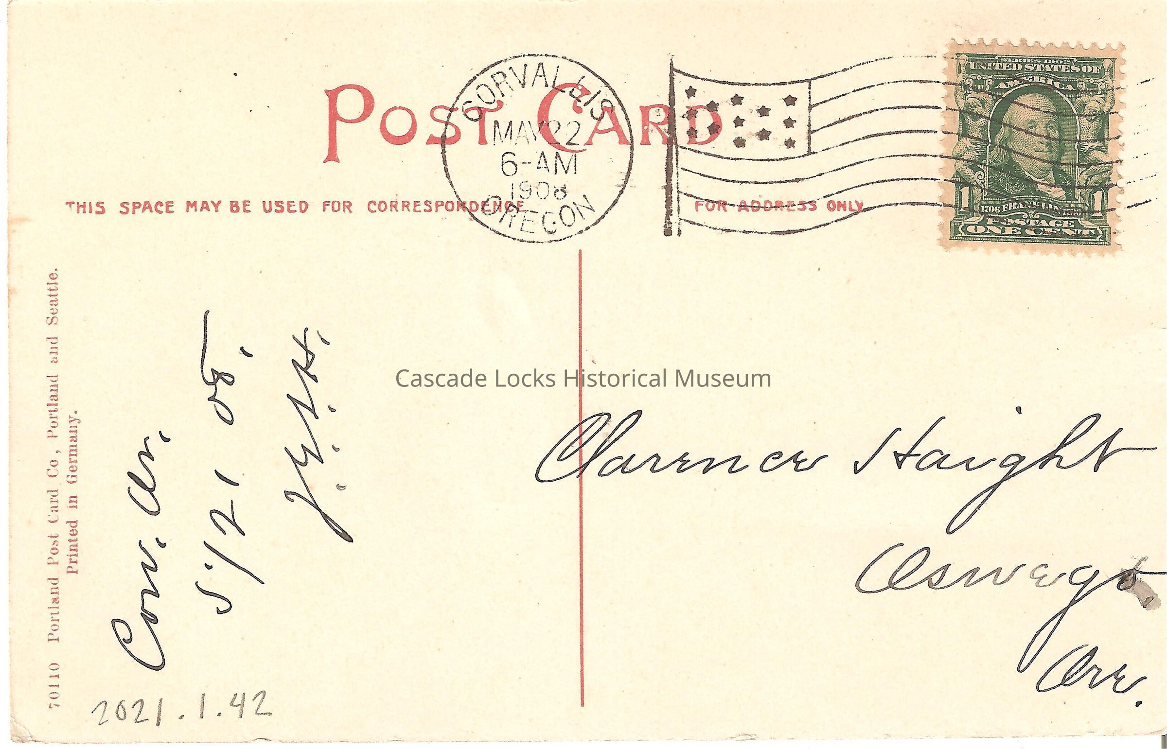Back of image reads, "Post Card. This Space May Be Used For Correspondence- Cow. Ar. s'/21 08, Jeist. For Address Only- Clarence Haight, Oswego, Ore. 70110 Portland Post Card Co, Portland and Seattle. Printed in Germany. Corvallis, Oregon. May 22, 6AM, 1908. United States of America 1706-1790 Franklin, Postage One Cent (Stamp)."Lexicon