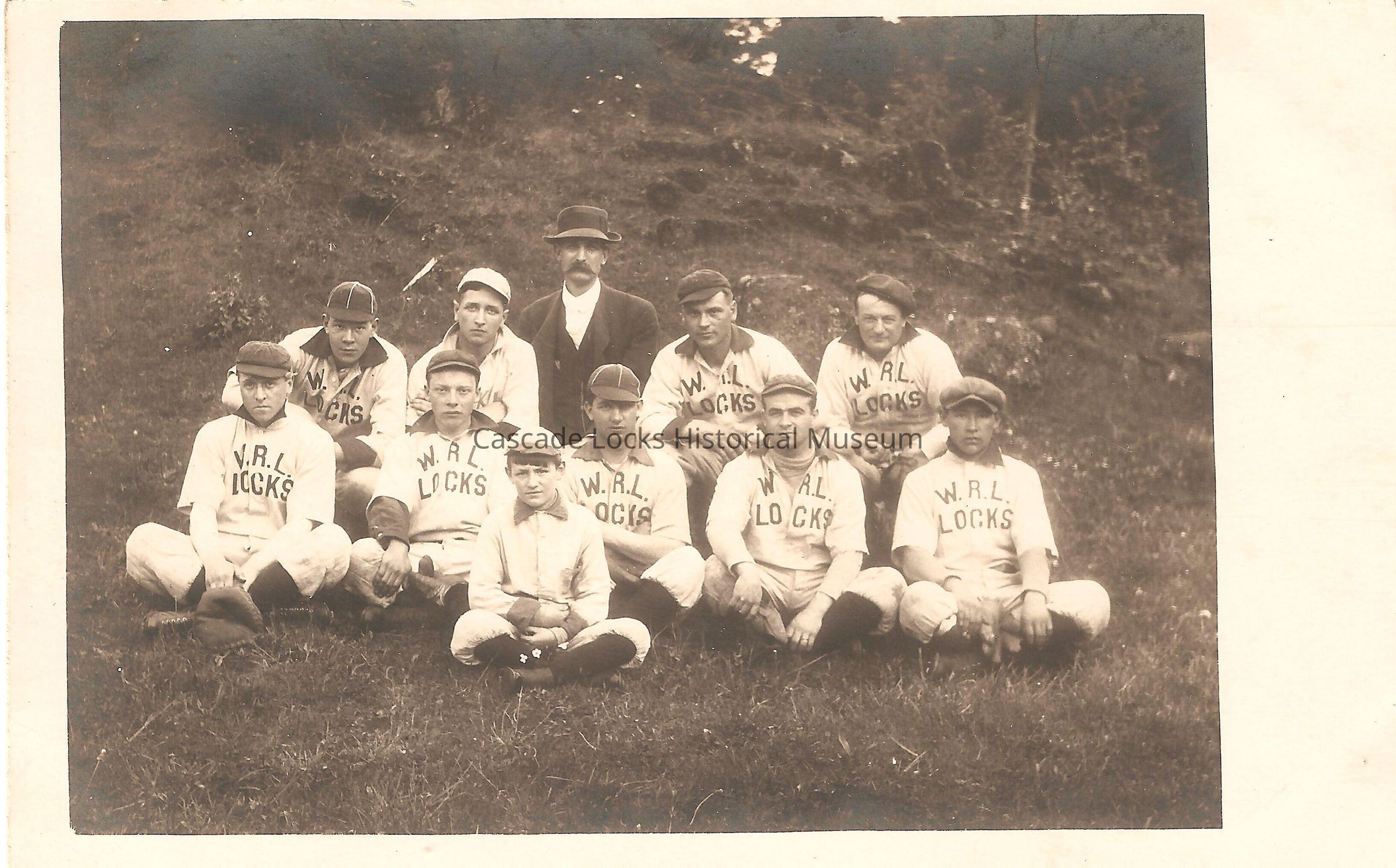Postcard, photograph image of a baseball team with uniforms that reads "W.R.L. Locks." There is a man in the back of the image in a suit that is likely the Coach. The abbreviation could stand for Wind River Lumber.