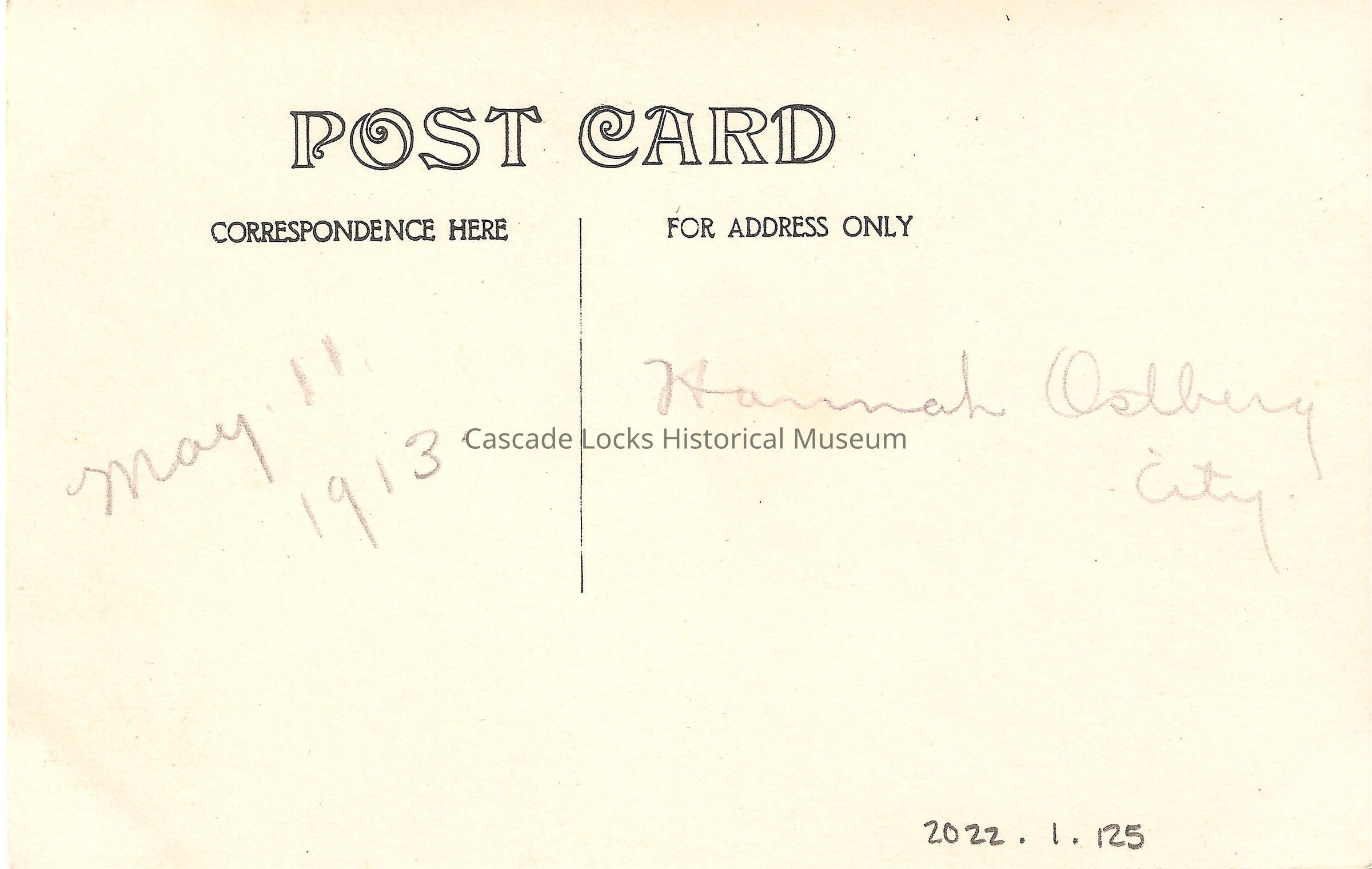 Back of image reads, "Post Card, Correspondence Here,-May 11, 1913. For Address Only- Hannah Ostberg City."Lexicon