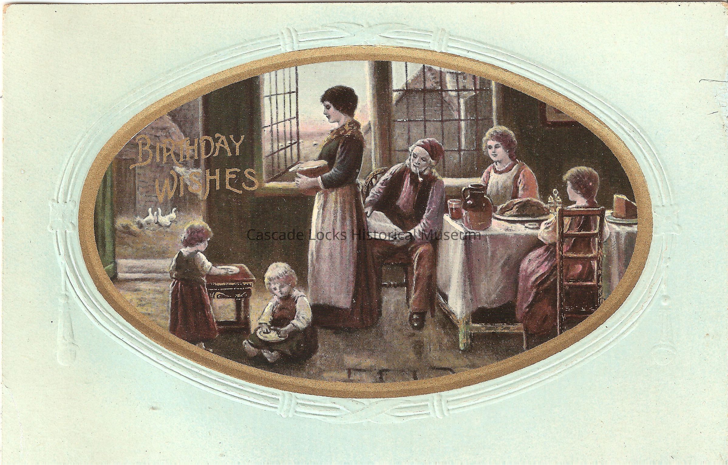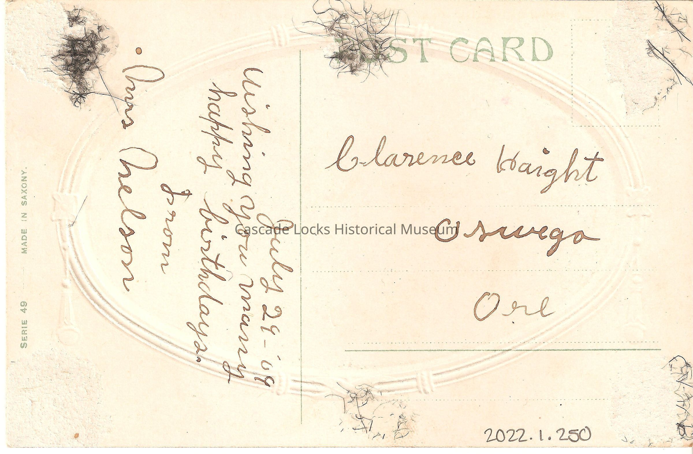 Back of image reads, "Post Card, Serie 49, made in Saxony. (To) Clarence Haight, Oswego, Ore. July 29-09. Wishing you many happy birthdays. From Mrs. Nelson"Lexicon