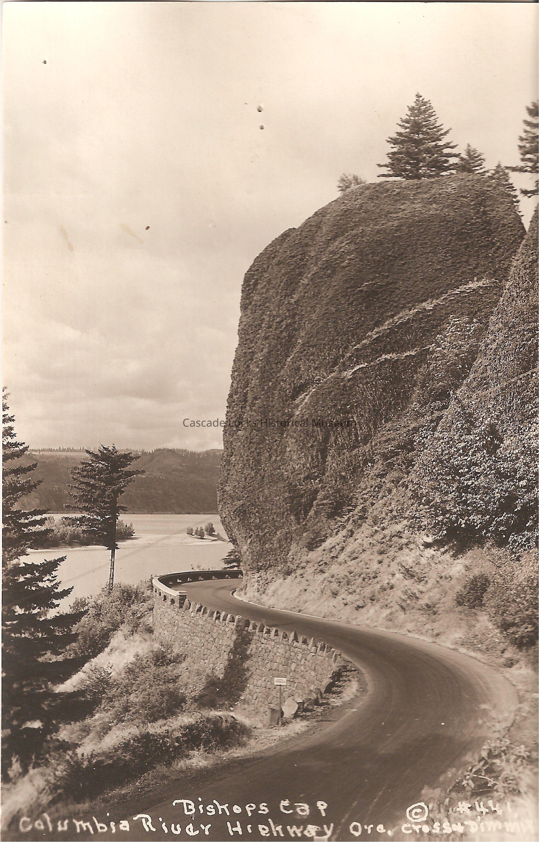 Postcard, image of the Bishops Cap along the Columbia River Highway. Card reads, "Bishop Cap, Columbia River Highway, Ore. #441 Cross & Dimmitt."
