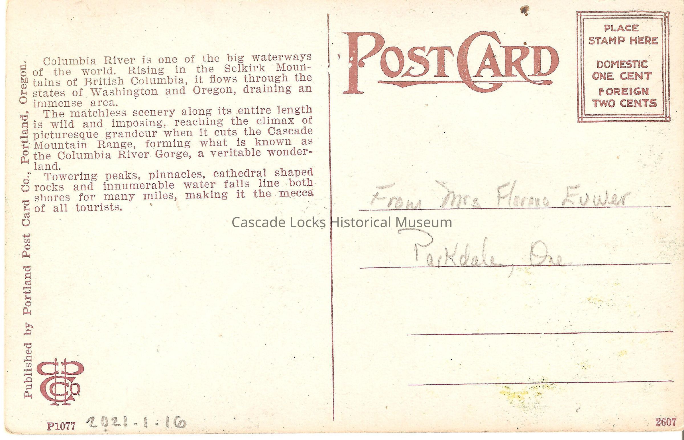 Back of image reads, "Post Card. Columbia River is one of the big waterways of the world. Rising in the Selkick Mountains of British Columbia, it flows through the states of Washington and Oregon, draining an immense area. The matchless scenery along its entire length is wild and imposing, reaching the climax of picturesque grandeur when it cuts the Cascade Mountain Range, forming what is known as the Columbia river Gorge, a veritable wonderland. Towering peaks, pinnacles, cathedral shaped rocks and innumerable water falls line both shores for many miles, making it the mecca of all tourists. From Mrs Florence Euwer, Parkdale, Ore. Published by Portland Post Card Co., Portland, Oregon. P1077. Place Stamp Here, Domestic One Cent, Foriegn Two Cents.Lexicon