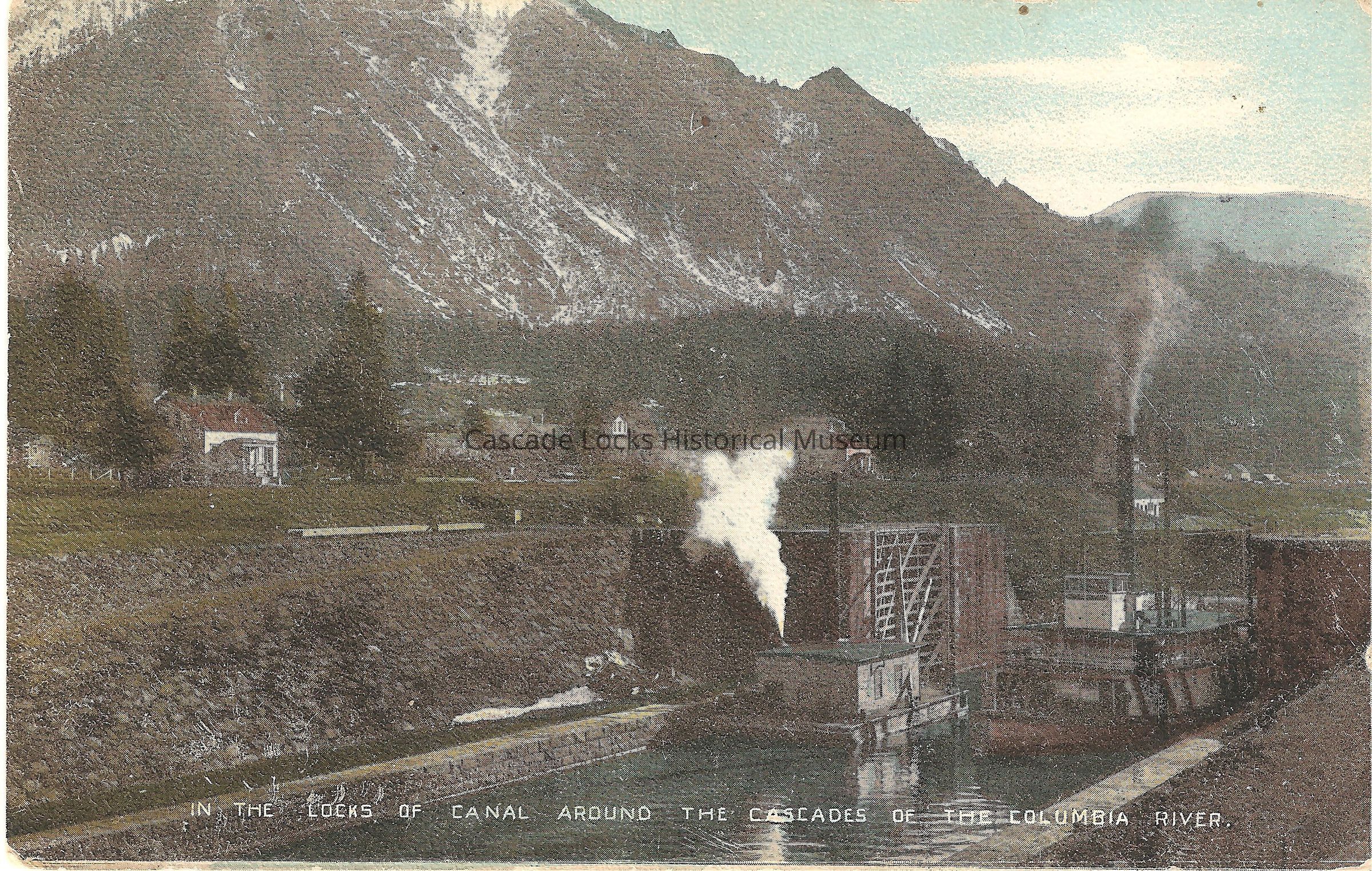 Postcard, illustrated image of the Cascade Locks and Canal. The base of the image reads, "In the Locks of the Canal around the Cascade of the Columbia River."