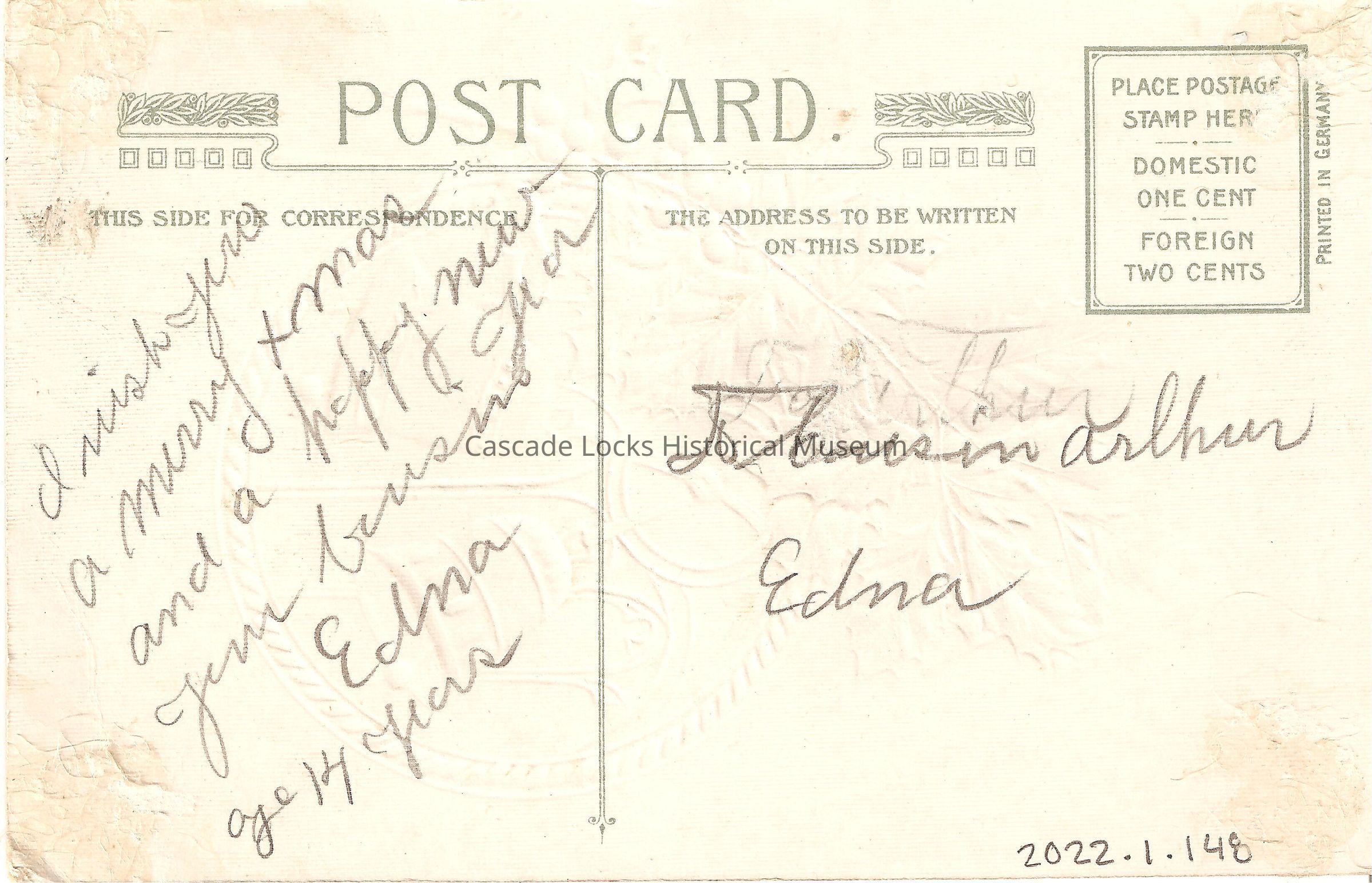 Back of image reads, "Post Card. This Side For Correspondence- I wish you a merry Xmas and a happy new year, Jim, Bernice, Edna, Age 14 years. The Address To Be Written On this Side- To Cousin Arthur, Edna. Place Postage Stamp Here, Domestic One Cent, Foreign Two Cents. Printed in Germany."Lexicon