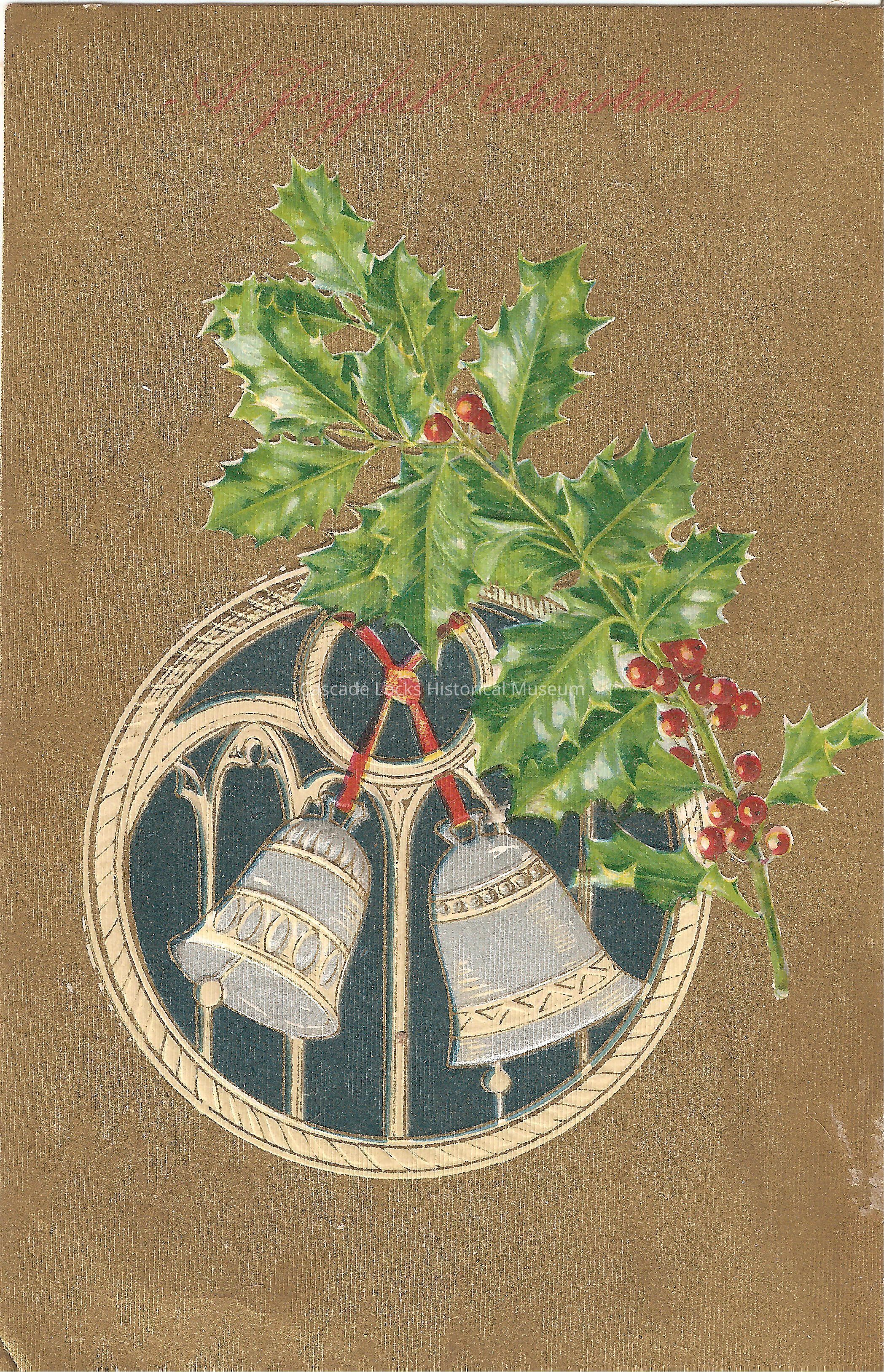 Postcard, illustrated image of two ringing silver bells with gold boarder and holly. Card reads, "A Joyful Christmas."
