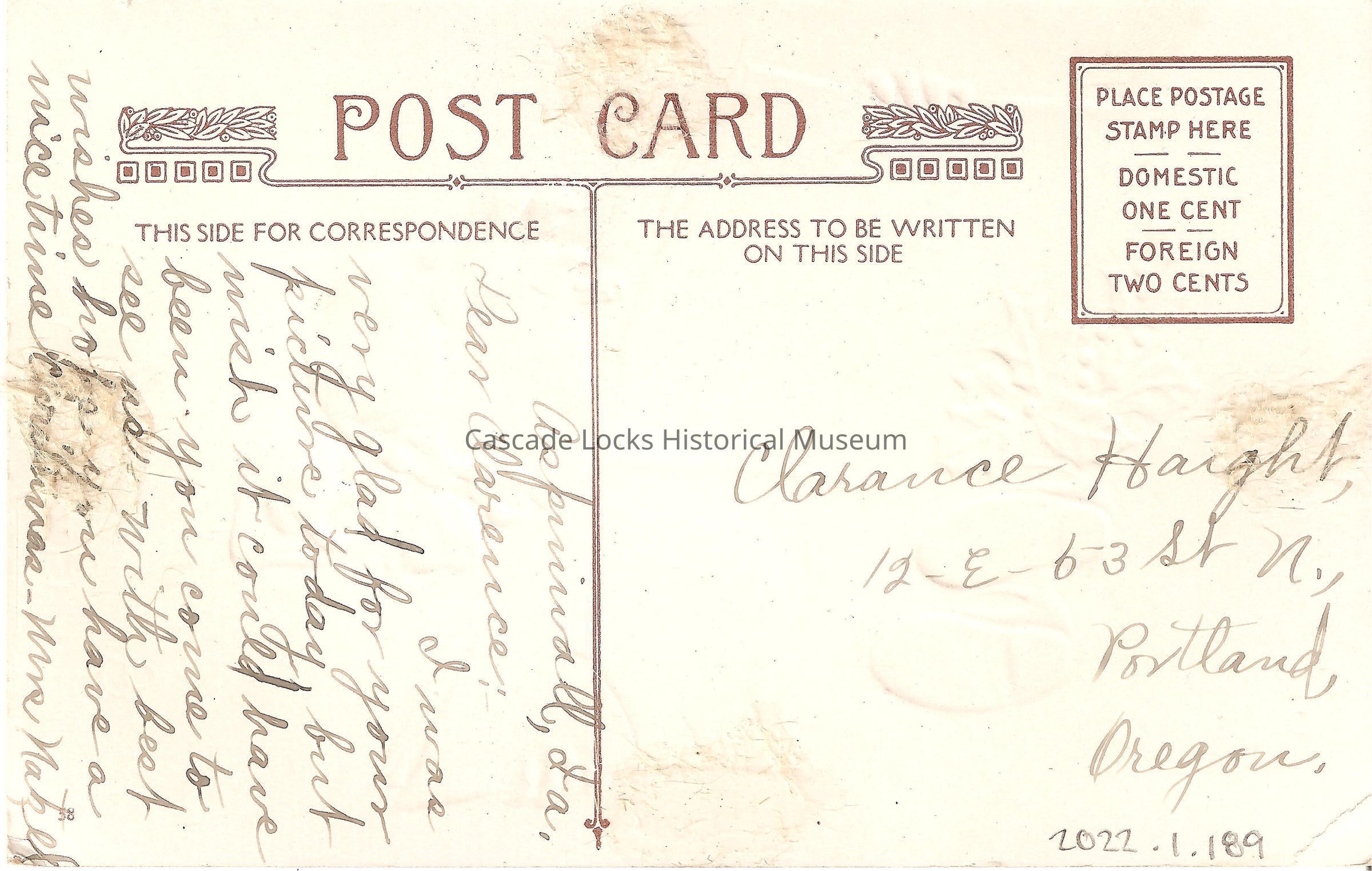Back of image reads, "Post Card, This Side For Correspondence- Asprinnall, FA. Dear Clarence, I was very glad for your picture today but wish it could have been you come to see us with best wishes, hope you have a nice time Christmas, Mrs. Natzel. The Address To Be Written On This Side- Clarence Haight, 12 E. 53r St. N. Portland, Oregon. Place Postage Stamp Here, Domestic One Cent, Foreign Two Cents"Lexicon