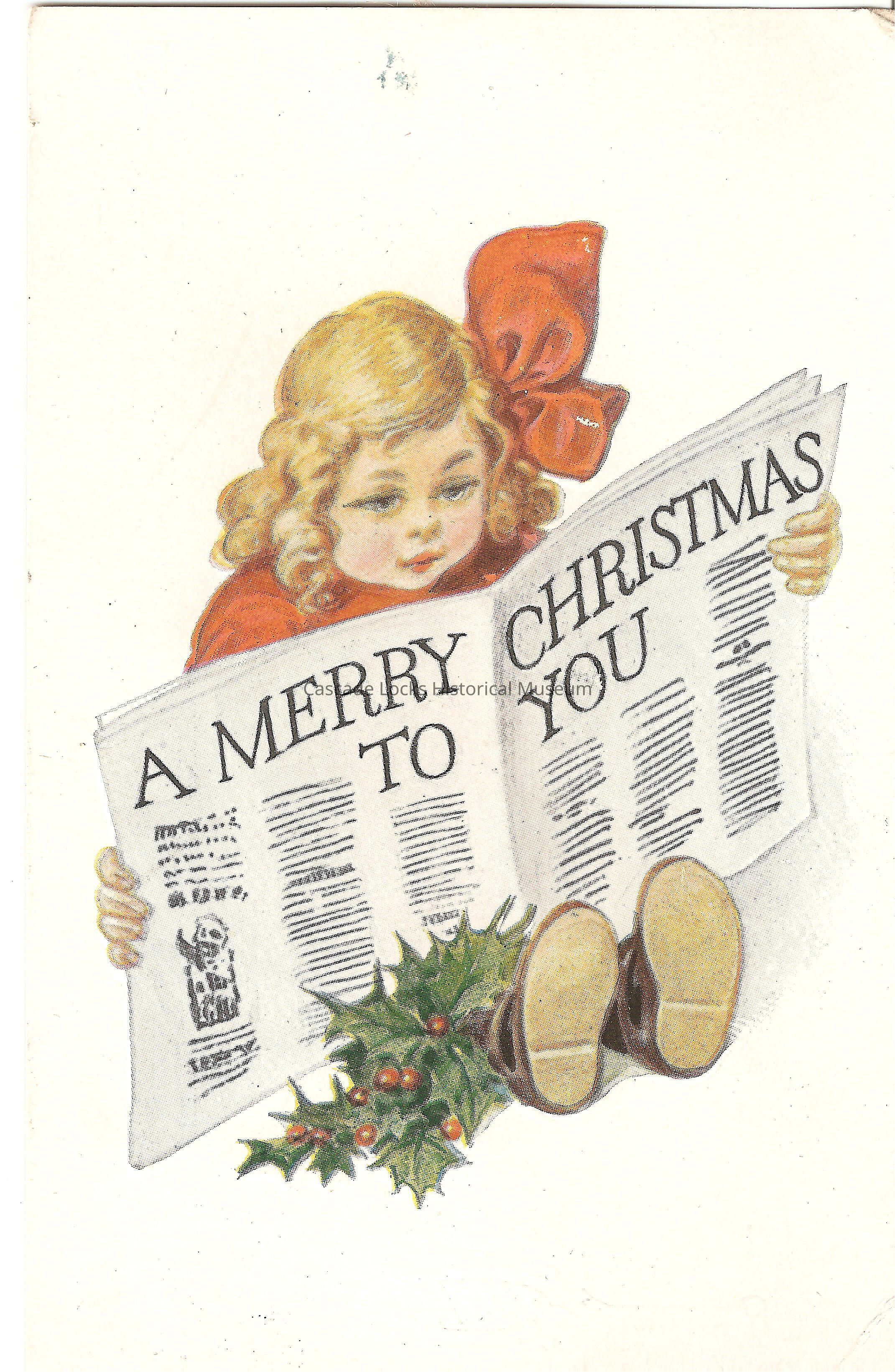 Post Card, illustrated image of a young girl reading a news paper with the title, "A Merry Christmas to you". On the girls legs is bunches of holly.