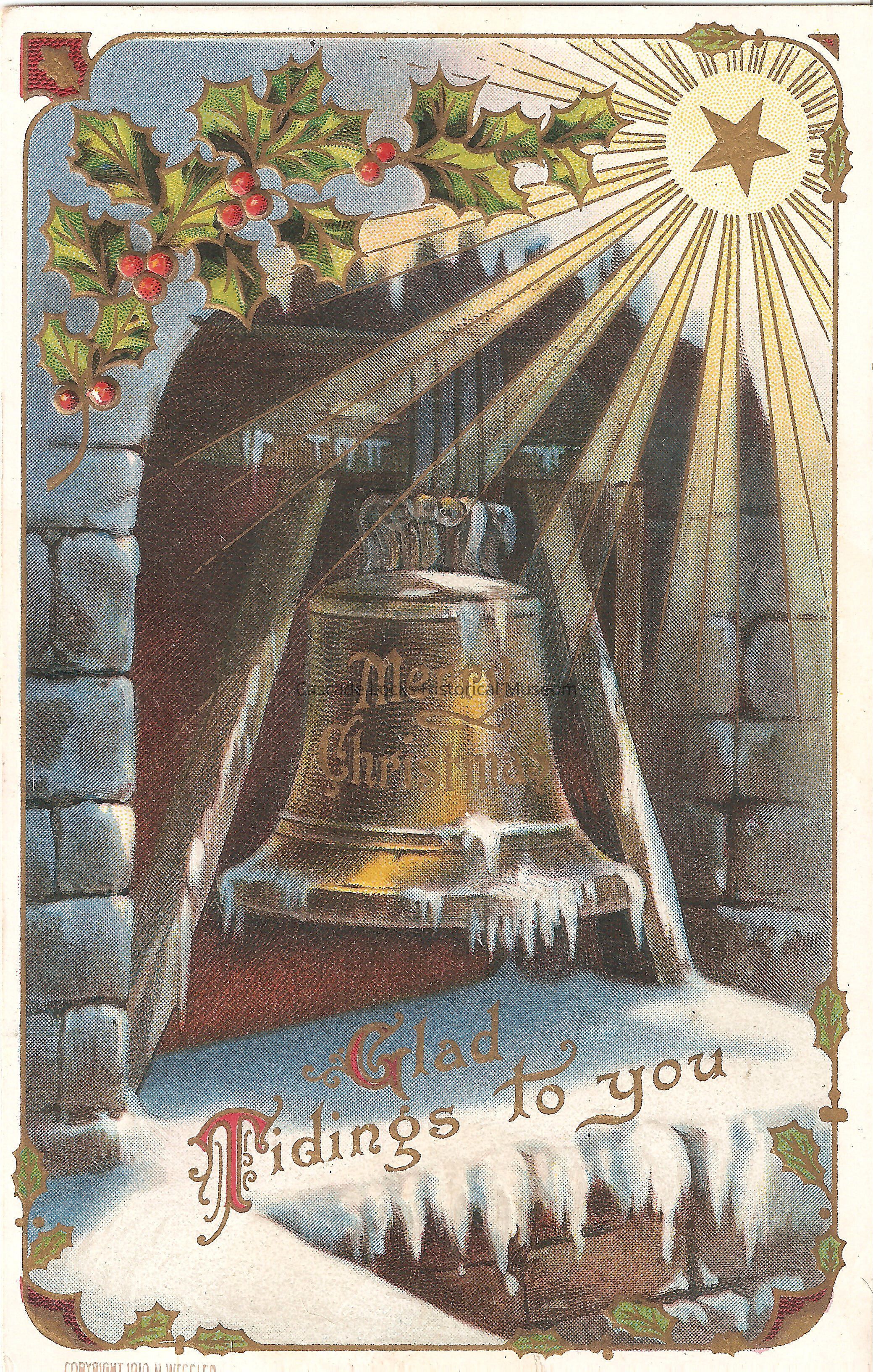 Post Card, illustrated image of a bell covered in snow, that reads, "Merry Christmas," below the bell reads, "Glad Tidings to you. Copywrite 1910, H. Wessler." Boarder of card has holly and a star.