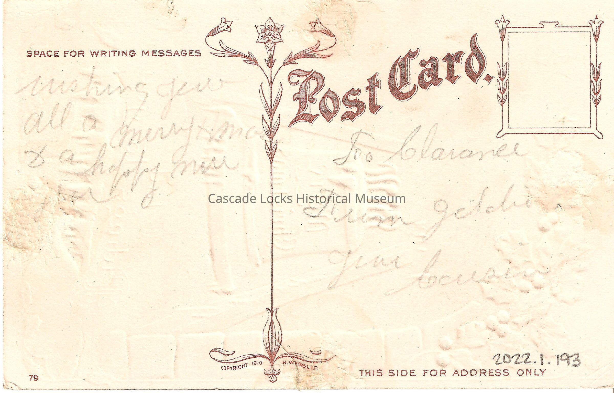 Back of image reads, "Post Card- Space For Writing Messages- Wishing you all a Merry Xmas & a Happy New Year. This Side For Address Only- Too Clarence From Goldie, Jims Cousin. Copyright 1910, H. Wessler. 79."Lexicon