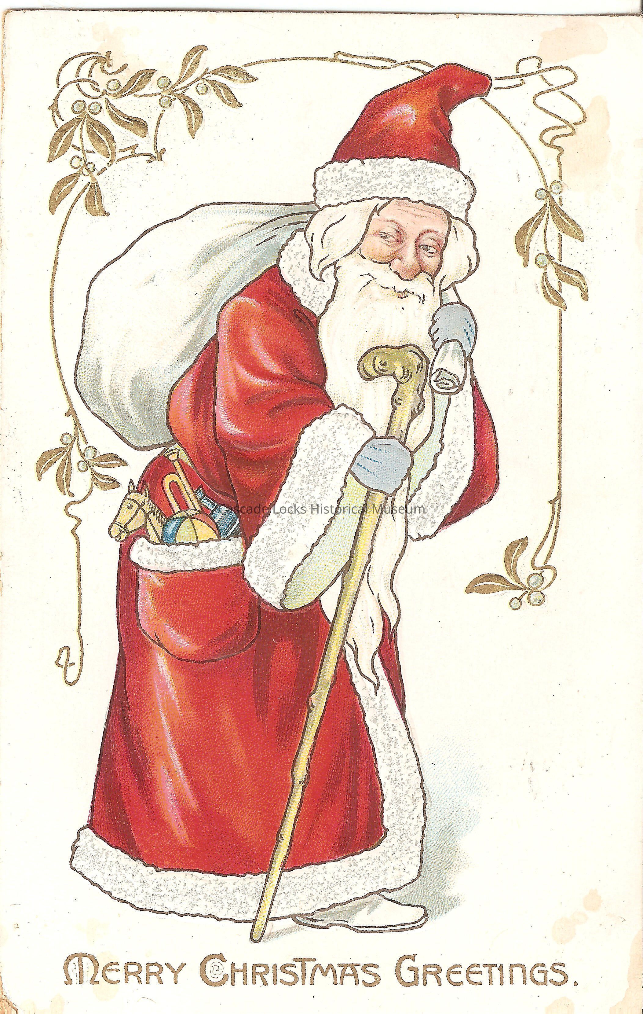 Post Card, illustrated image of Santa Claus in a red robe with white fur trim carrying a bag over his shoulder and using a wooden cane. There are toys in his pocket. The bottom front of the card reads, "Merry Christmas Greetings."