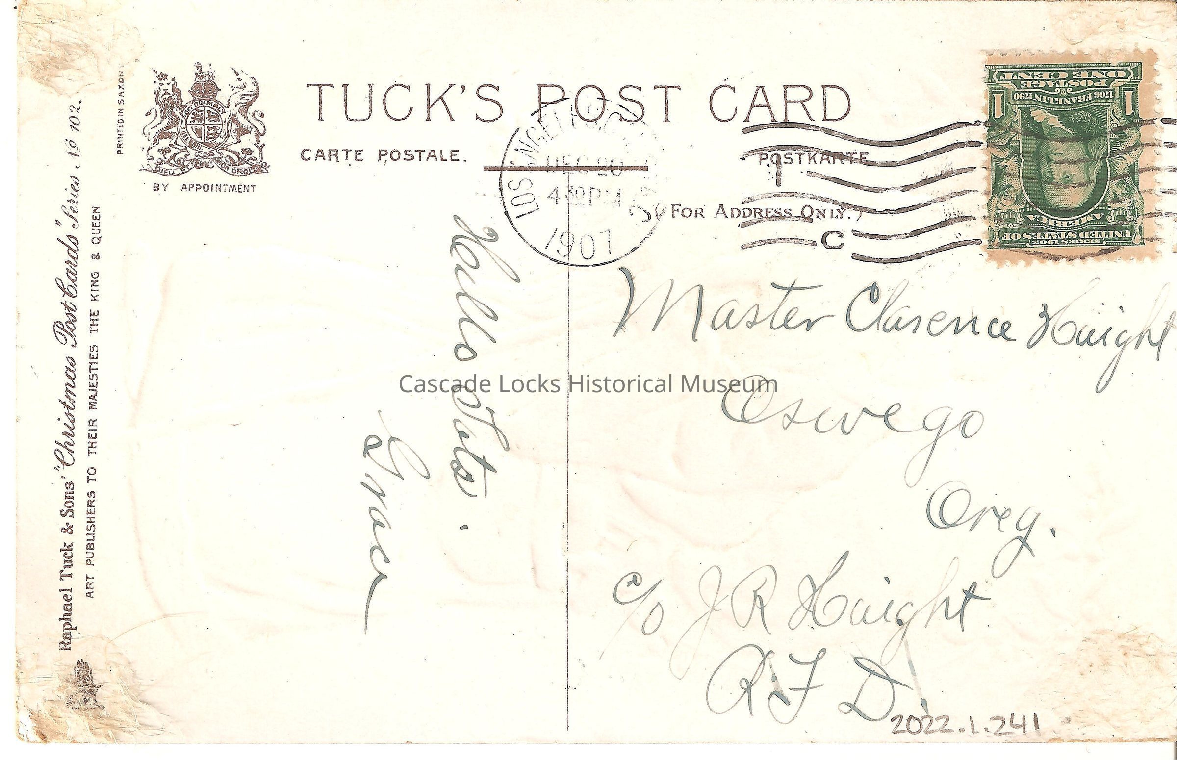 Back of image reads, "Tucks Post Card, Carte Postale, Postkarte For Address Only- Master Clarence Haight Oswego Oreg. c/o J. R. Haight R.F.D. Hello Lots- Grace. Raphael Tuck & Sons, Series No. 702. Art Publishers to their majesties the King and Queen. Printed in Saxony. By appointment. Los Angeles, Dec 20 430PM 1907. United States of America 1706-1790 Franklin, Postage One Cent (Stamp)"Lexicon
