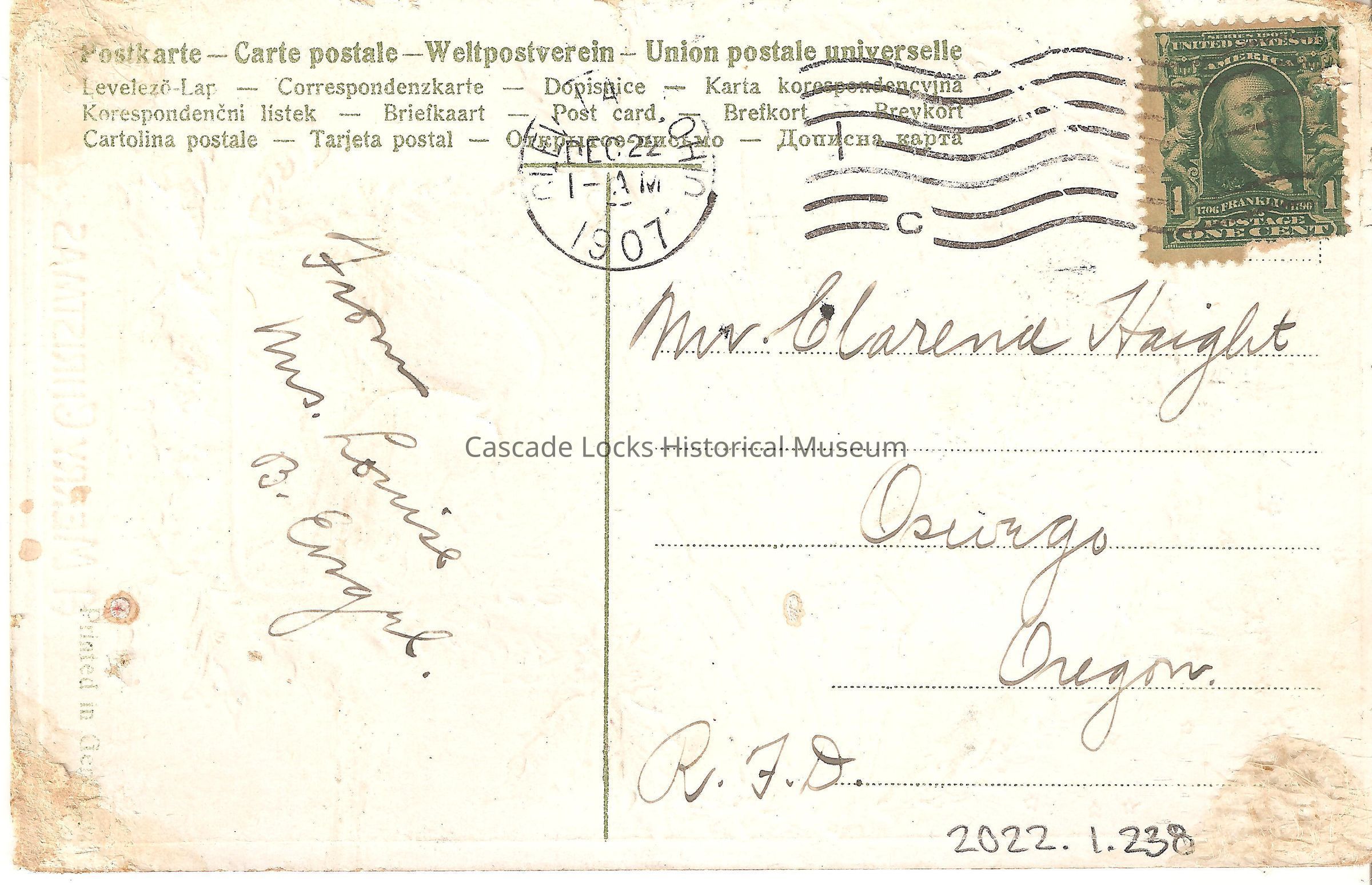 Back of image reads, "Postkarte- Carte Postale- Weltpostverein- Union Postale Universelle- Levelezo-Lap- Correspondenzkarte- Dopinice- Karte Korespondencvjna Koresspondencni Listek- Briefkaart- Post Card- Brefkort- Breyjort Cartolina Postle- Tarjeta Postl- [Something in Russian] Printed in Germany. Ohio Dec 22, 1AM, 1907. From Mrs. Louise B. Engal. Mr. Clarence Haight Oswego, Oregon. R.F.D. United States of America 1706-1790 Franklin, Postage One Cent (Stamp)"Lexicon