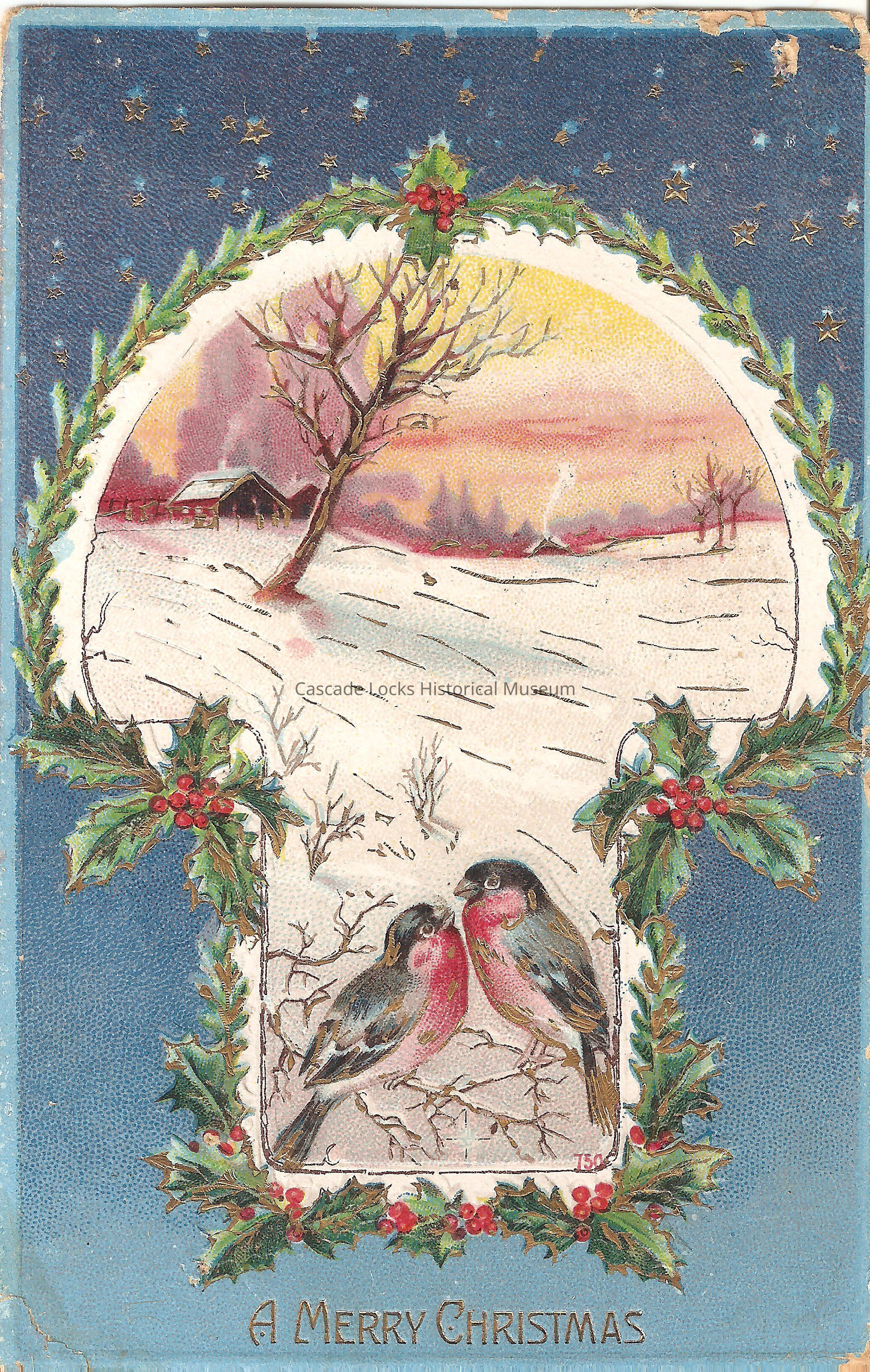 Post Card, illustrated image of an two birds in a snowy landscape with houses in the background. Boarder of image is blue with stars and holly. Bottom of image reads, "A Merry Christmas."
