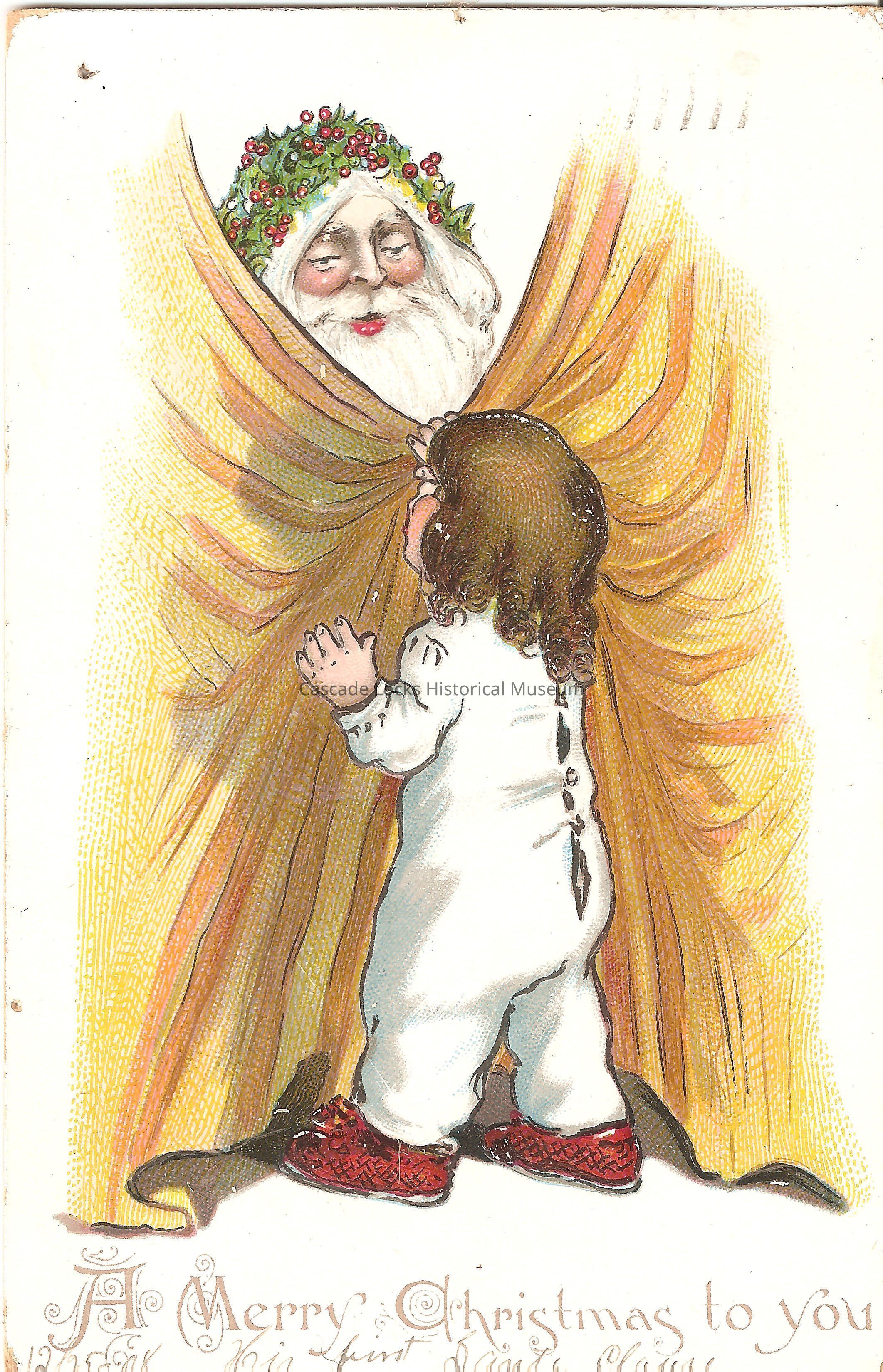 Post Card, illustrated image of a child pulling down a yellow curtain to see Santa Claus behind it. The base of the card reads, "A Merry Christmas to you. (Written) 12/25/(19)08 H is hint Santa Claus."