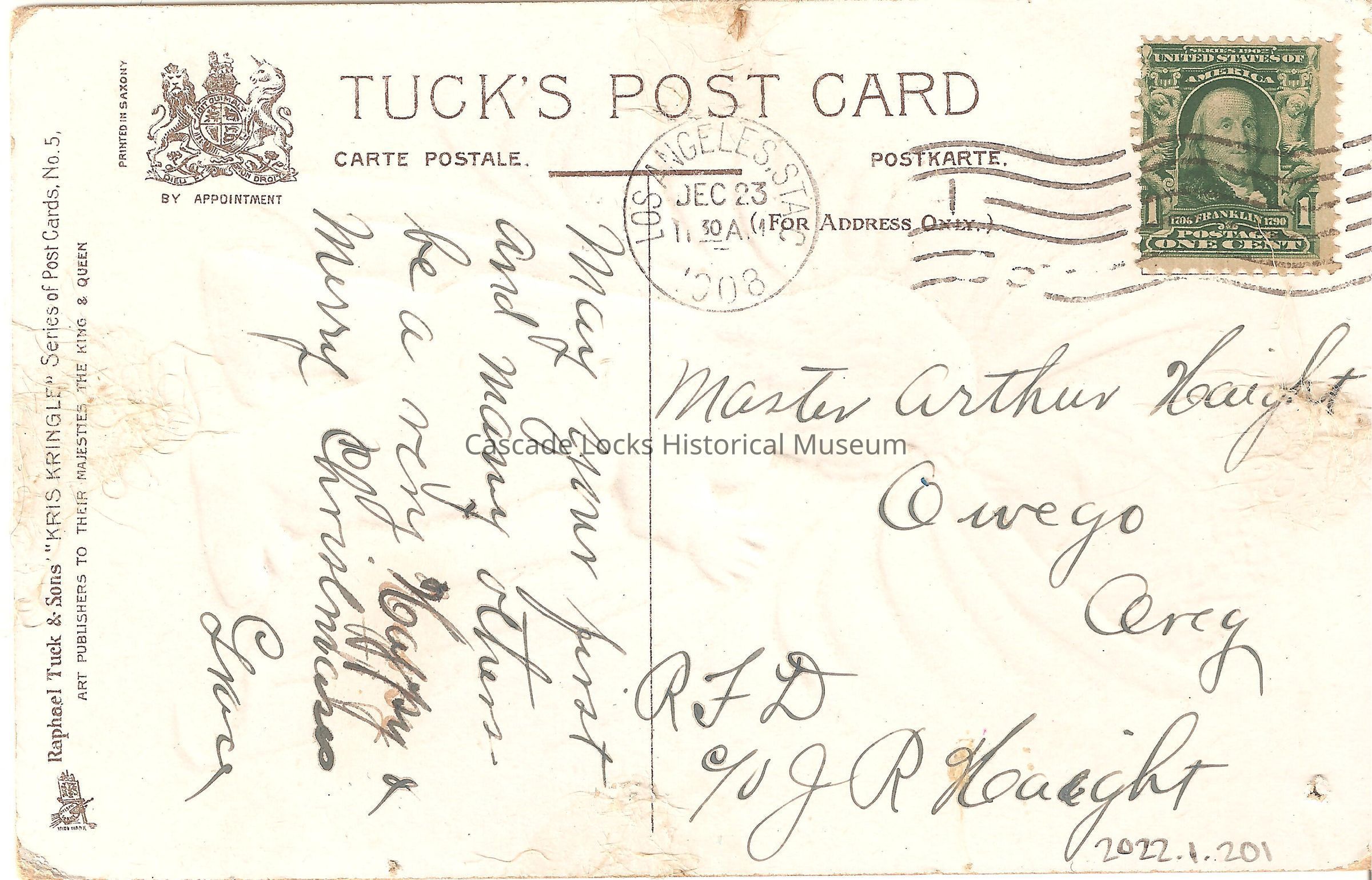 Back of image reads, "Tuck's Post Card- Carte Postale. Postkarte. May your first and many others be a very Happy & Merry Christmas- Grace. For Address Only- Master Arthur Haight, Oswego, Oreg. R.F.D. c/o J R Haight. Raphael Tuck &Sons' "Kris Kringle" Series of Post Cards, No. %. Art Publishers to their Majesties, the King and Queen. Printed in Saxony. By Appointment. Los Angeles STA C, Dec 23, 1-30AM, 1908. United States of America 1706-1790 Franklin, Postage One Cent (Stamp)."Lexicon