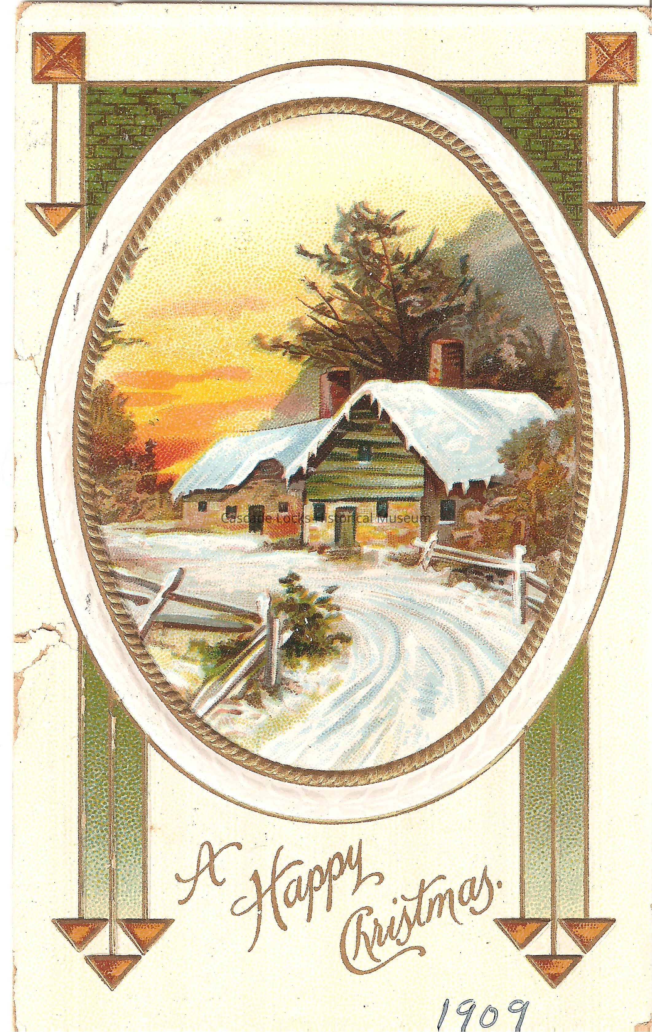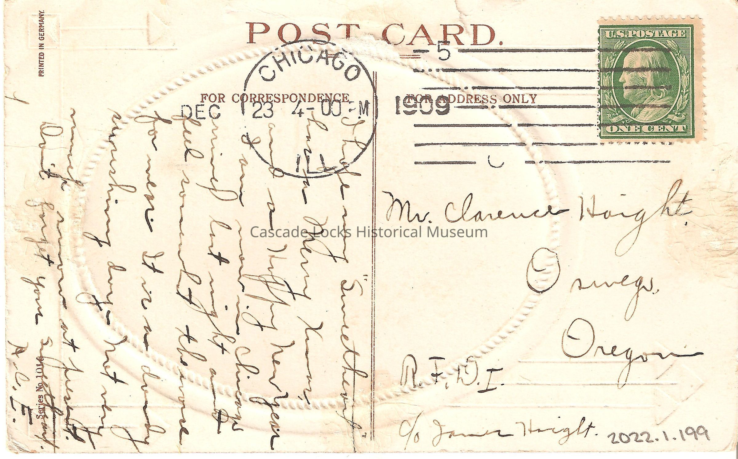 Back of image reads, "Post Card, For Correspondence- I hope my "sweetheart" has a Merry Xmas and a Happy New Year. I am now in Chicago arrived last night and feel (?) the more for men. It in a (?) met very much snow at first. Dont forget your sweetheart. H.C.E. For Address Only- Mr. Clarence Haight, Oswego, Oregon, c/o James Haight. R.I.F.I. Chicago, Ill. Dec 23 400PM 1909. Series No. 1016. Printed in Germany. US Postage, One Cent (Stamp)."Lexicon