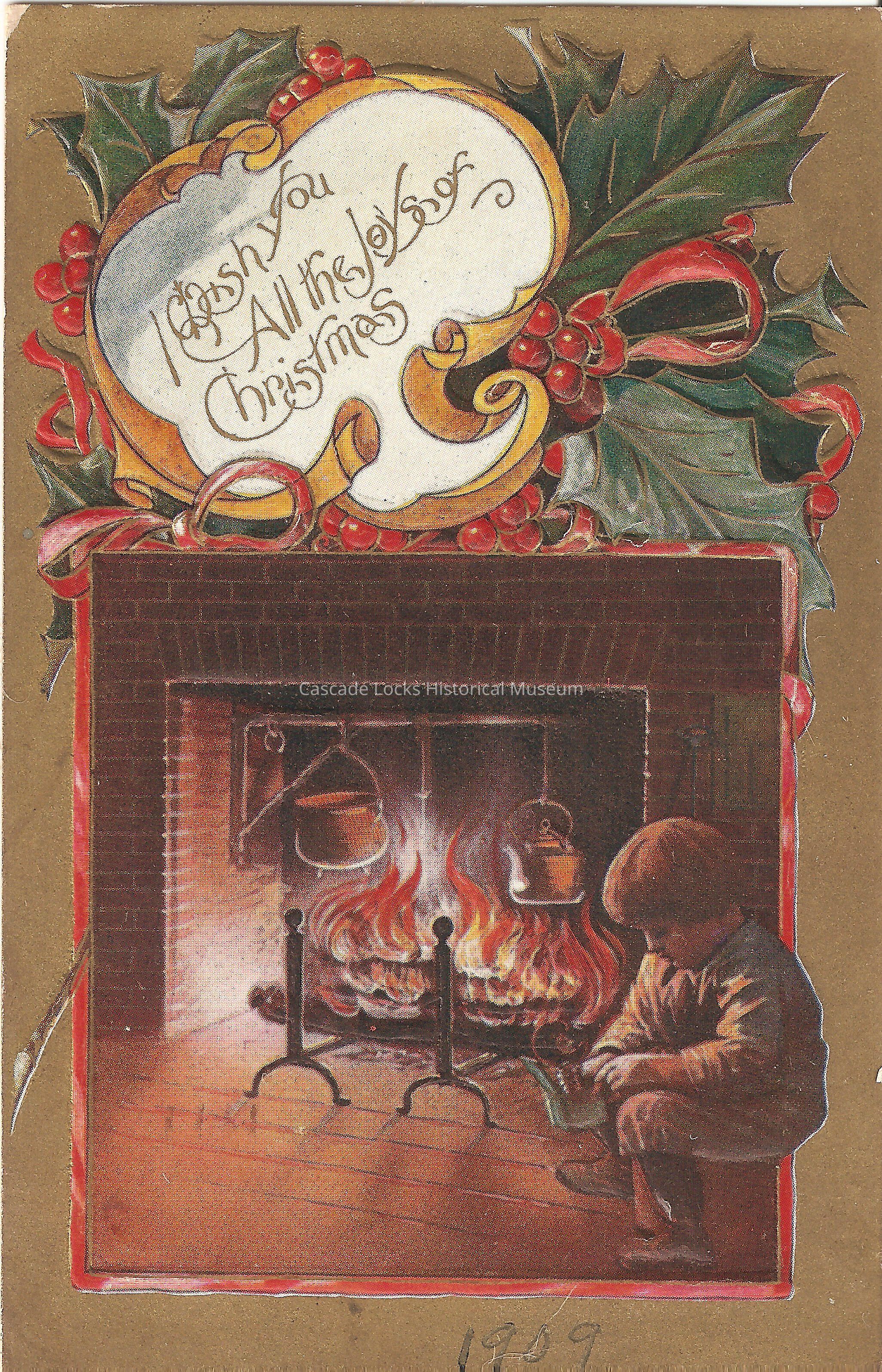 Post Card, illustrated image of a child sitting in front of a brick mantel fire place playing with a jack in the box. The boarder of the card is gold. The upper third of the card is holly and ribbon. The Upper middle of the card reads, "I wish you all the joys of Christmas."