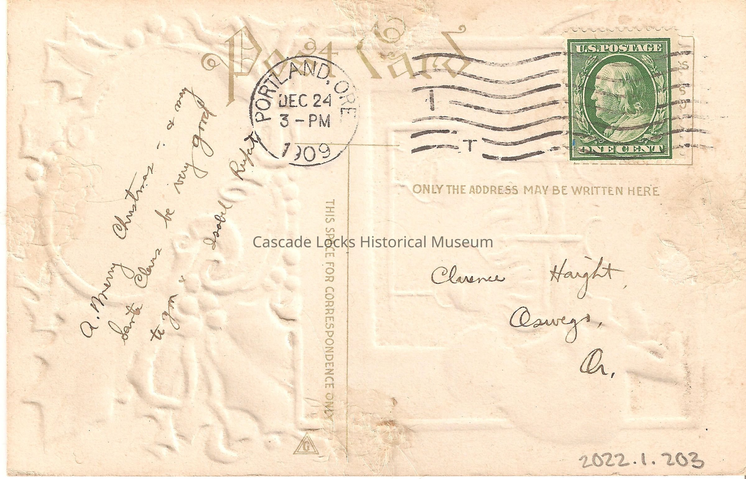 Back of image reads, "Post Card- This Space For Correspondence Only- Merry Christmas & may Santa Claus be very good to you. Isobel Rupat. For Address Only To Be Written Here- Clarence Haight, Oswego, Oregon. Portland, Ore. Dec 24, 3-PM, 1909. U.S. Postage, One Cent (Stamp)."Lexicon