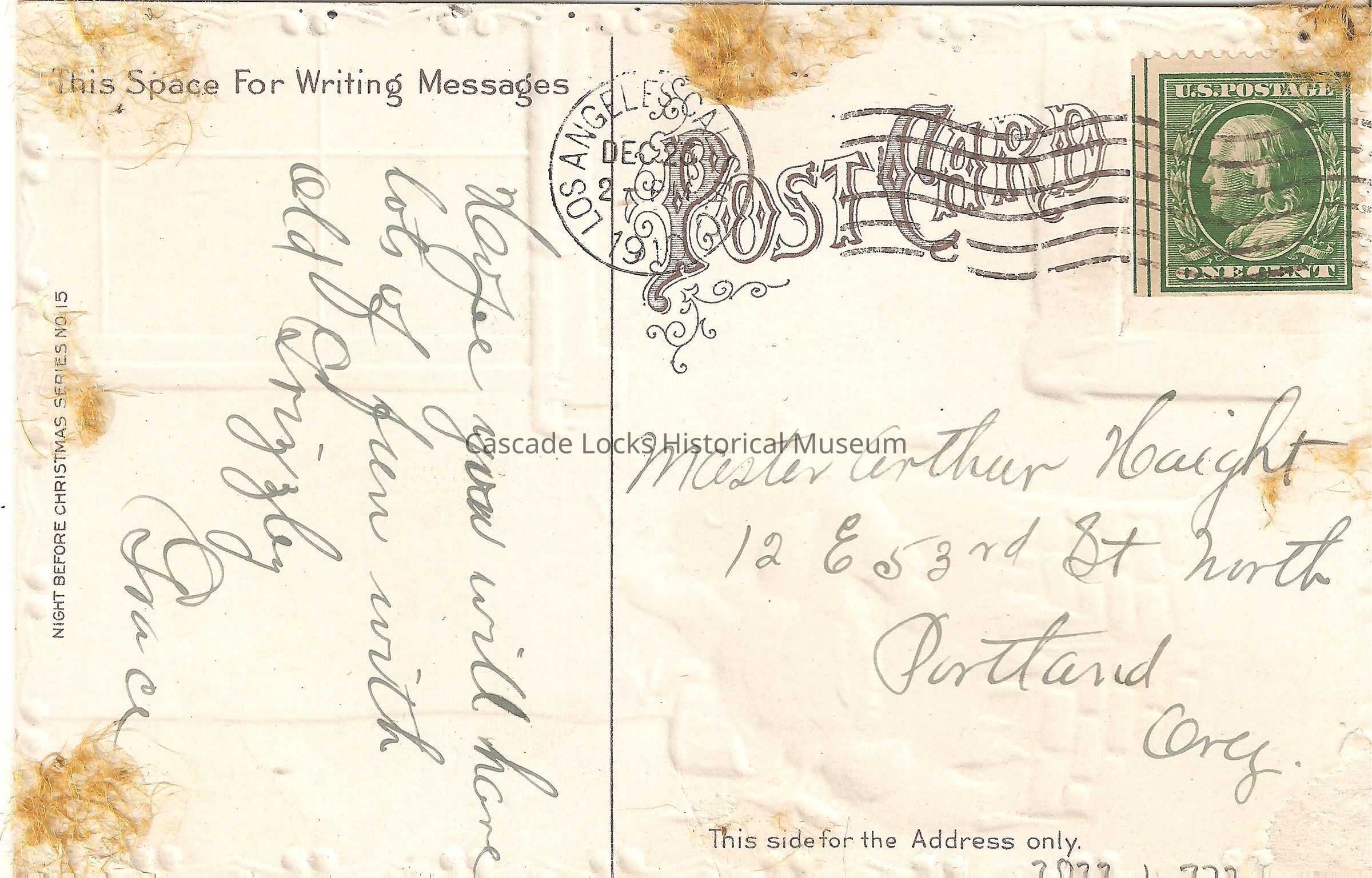 Back of image reads, "Post Card, This Space For Messages- (?) you will have lots of fun with old Grizzly- Grace. This side for the Address only- Master Arthur Haight, 12 E. 53rd St. North. Portland, Oreg. Los Angeles. Dec 23, 2-PM, 1910. U.S. Postage, One Cent. Night Before Christmas Series No. 15."Lexicon