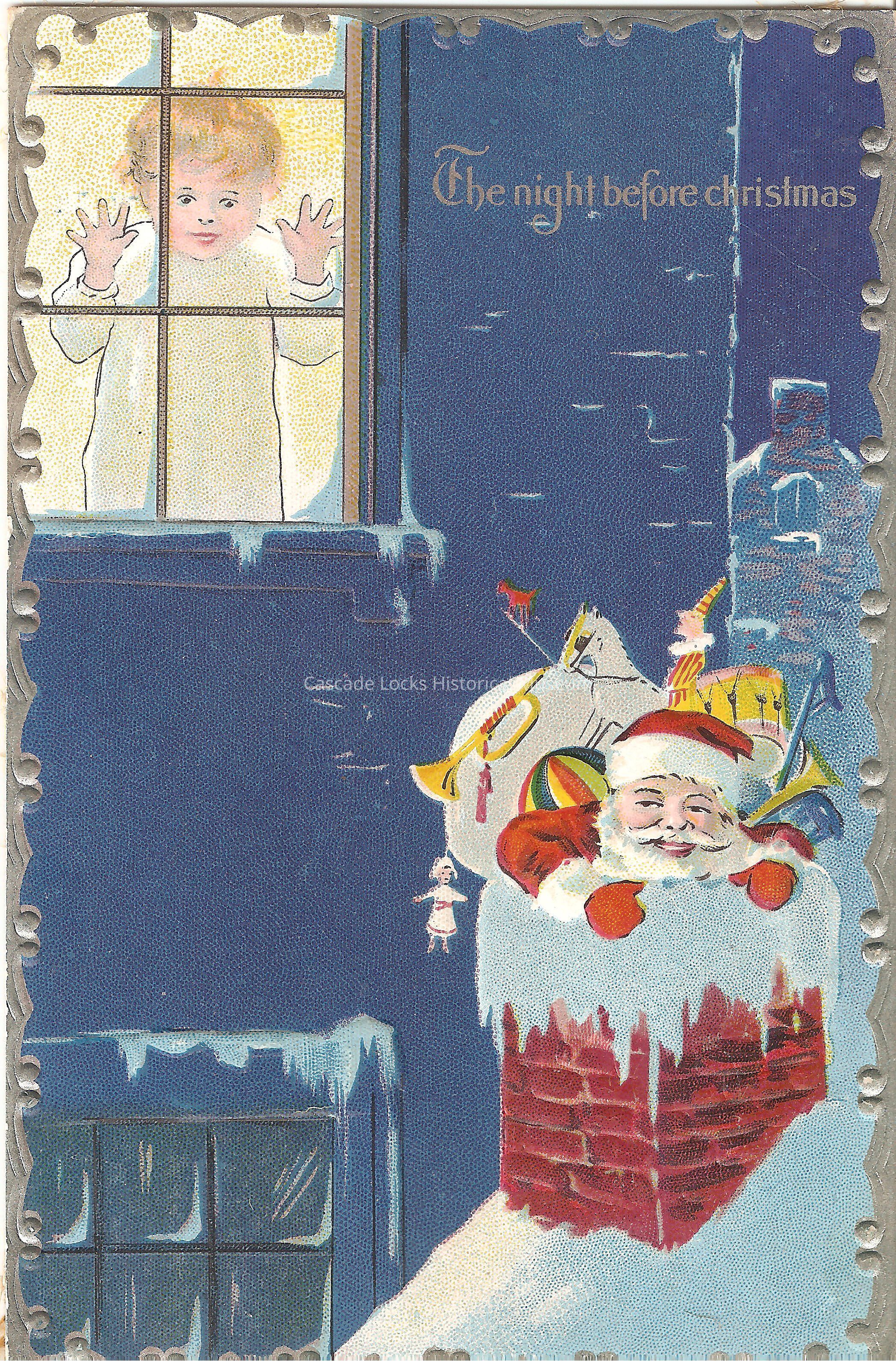 Post Card, illustrated image of Santa Claus going down a chimney with a bag filled with toys while a child looks out a window watching. The card is mainly blue with silver boarder. The upper right corner of the image reads, "The night before Christmas."