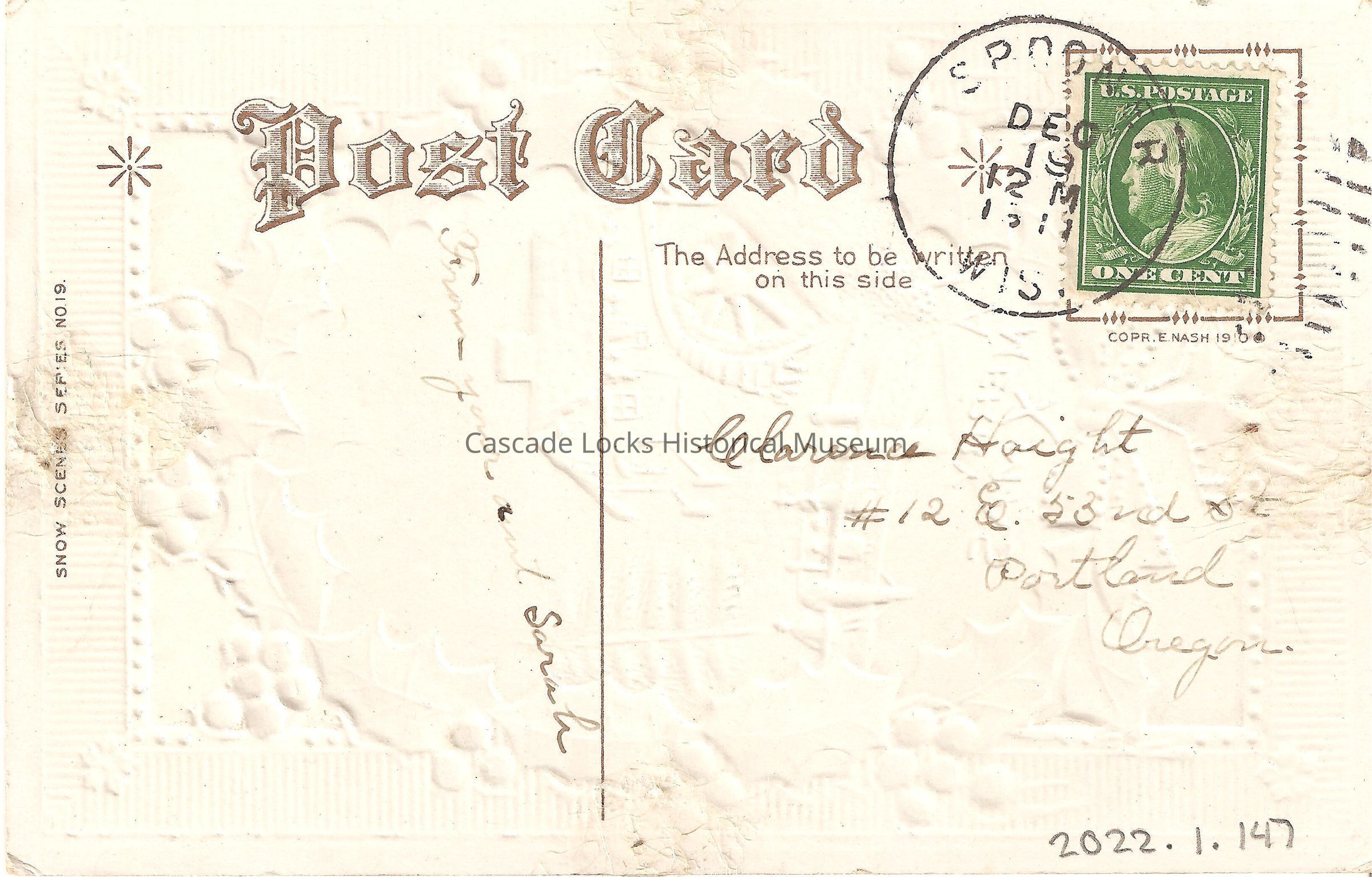 Back of image reads, "Post Card. From your Aunt Sarah. The Address to be written on this side- Clarence Haight, #12 E. 53rd St, Portland, Oregon. Spooner, Wis. Dec 19, 12PM 1911. U.S. Postage, One Cent. Snow Scenes Series No.19. Corp. E. Nash, 1910."Lexicon