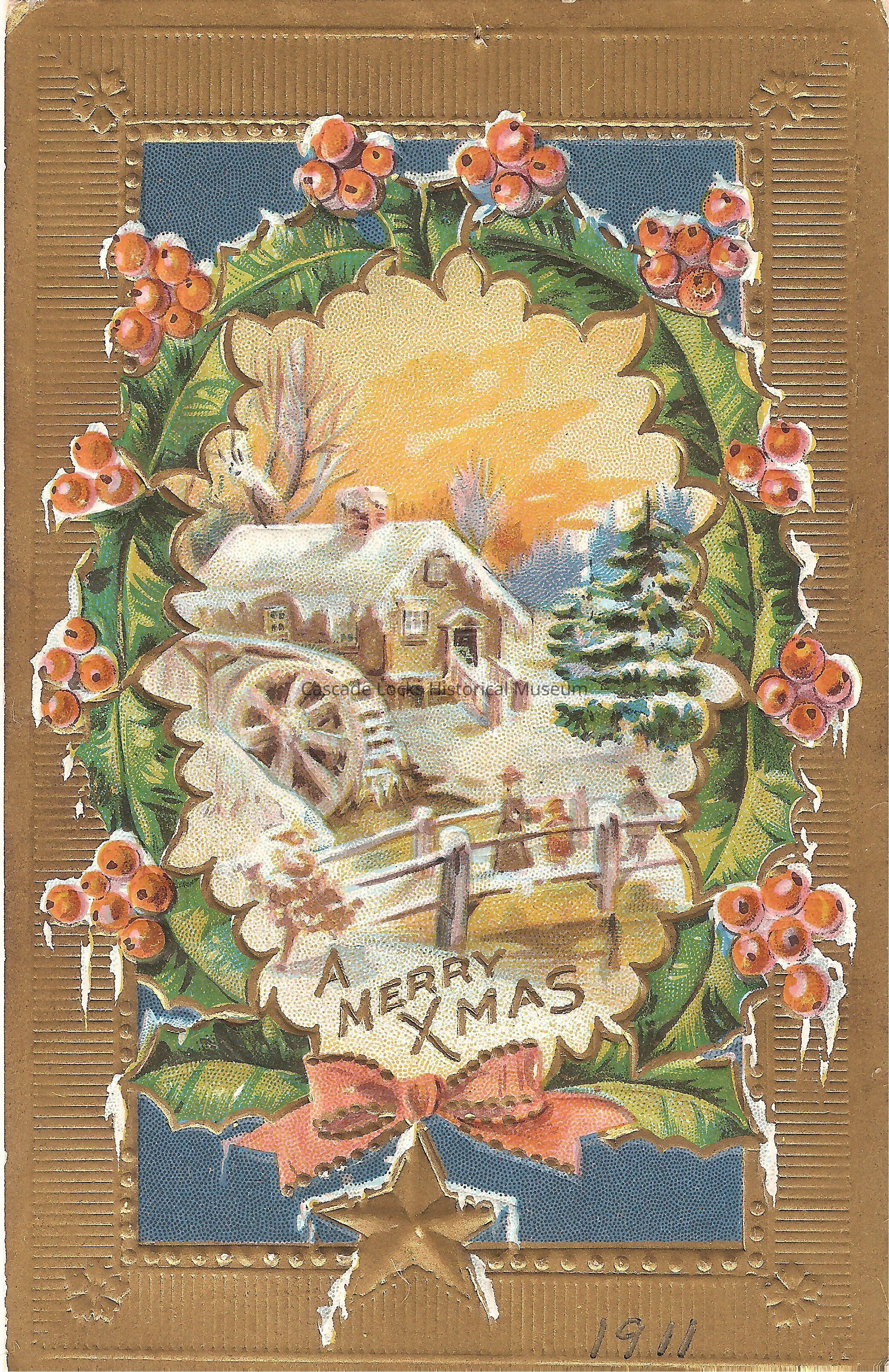 Postcard, illustrated image of a snow-scape with a home, watermill on a creek and a bridge over the creek with a gold boarder. Card reads, "A Merry Xmas."