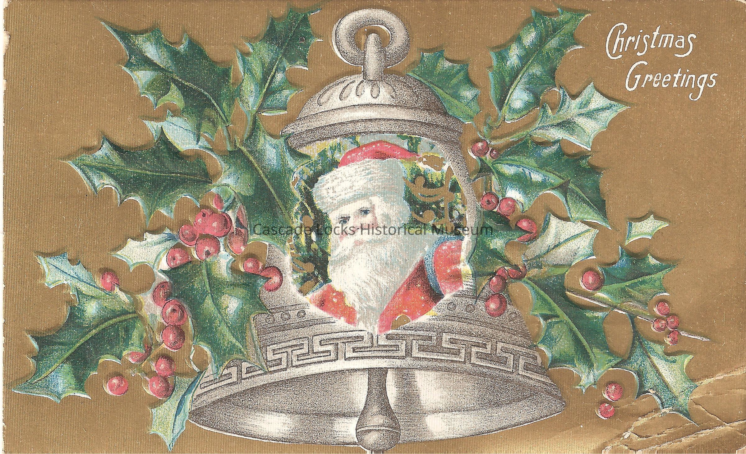 Post Card, illustrated image of Santa Claus, portrait style, with a bell covered in holly behind him. The upper right corner of the card reads, "Christmas Greetings."