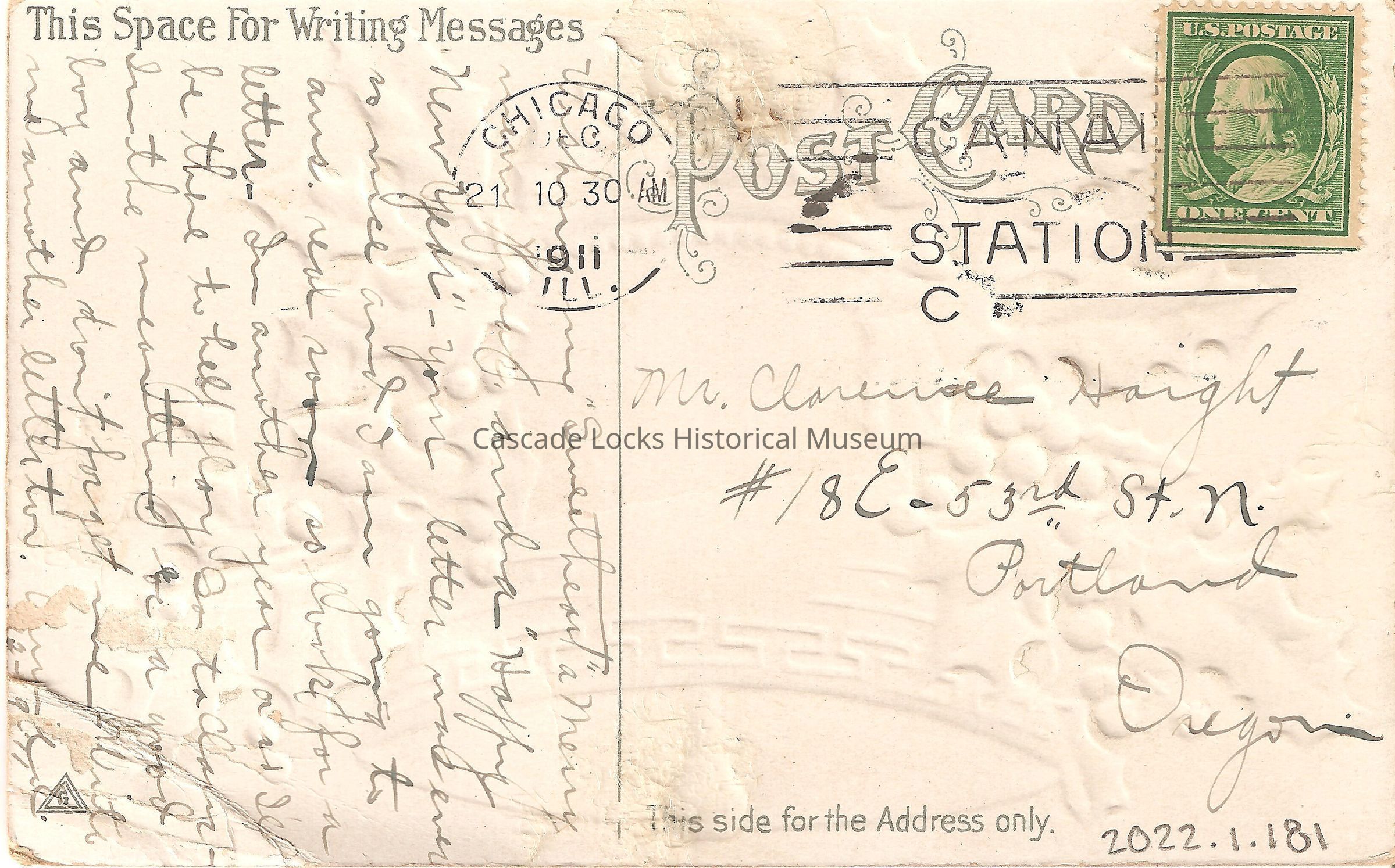 Back of image reads, "Post Card, This Space For Writing Messages- Wishing my "sweetheart" a Merry Merry Xmas and a "Happy New Year." your letter was ever so nice and I am going to (?) real soon so look for a letter. In another year and ill be there to help (?) so talking in the meantime be a good boy and don't forget me with me another little to- Annie. 12/19/(19)11. This Side For The Address Only- Mr. Clarence Haight, #18 E. 53rd St. N. Portland, Oregon. Chicago, Ill. Dec 21, 1030AM, 1911. Canal Station C. U.S. Postage, One Cent."Lexicon