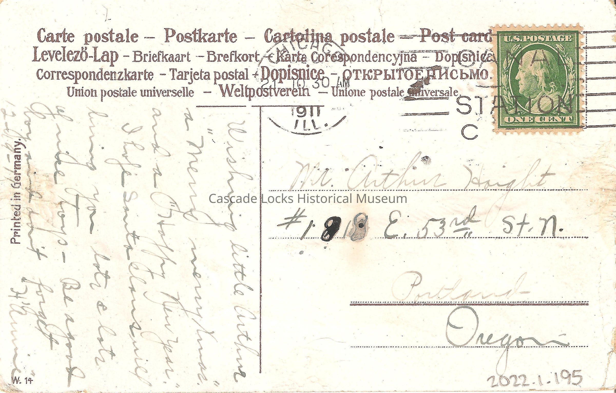Back of image reads, "Carte Postale- Postkarte- Cartolina Postale- Post Card- Levelezo-Lap- Briefkaart- Brekort- Karta Corespondencyjna- Dopisnica- Correspindenzkarte- Tarjeta Postal- Dopisnice- (Russian)- Union Postale Universelle- Weltpostverein- Unione Postale Universale. Printed in Germany. W14. Wishing little Arthur a "Merry Merry Christmas" and a "Happy New Year." I hope Santa Claus will bring you lots and lots of nice toys- Be a good boy and don't forget. H. Annie. 12/19/11. Mr. Arthur Haight, #18 E. 53rd St. N. Portland, Oregon. U.S. Postage, One Cent. Chicago, Ill. 21, 1030 AM, 1911. Canal Station C."Lexicon