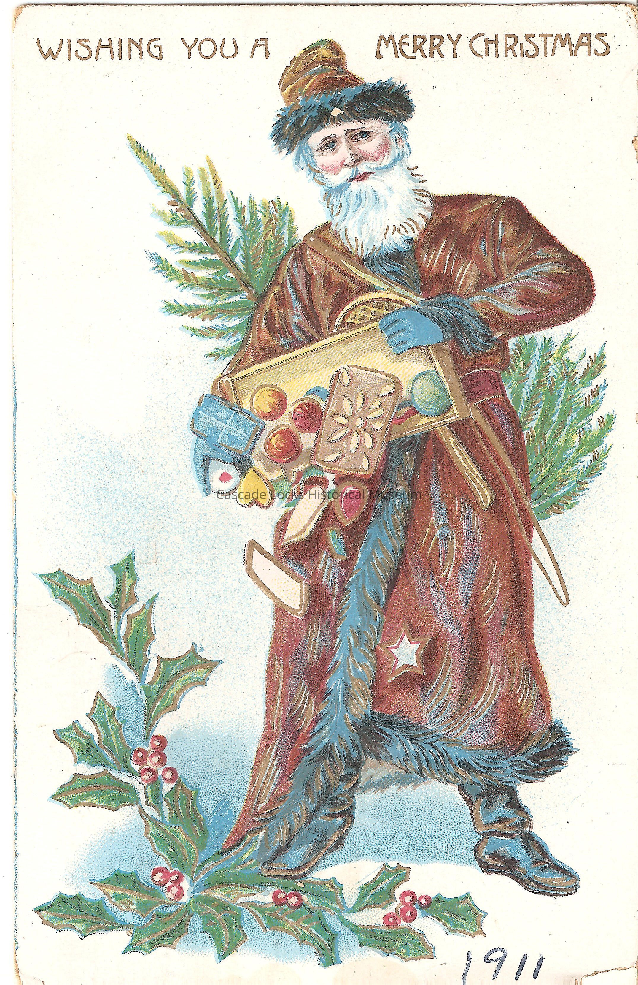 Post Card, illustrated image of Santa Claus dumping out a box filled with baked goods. Top of card reads, "Wishing You A Merry Christmas."