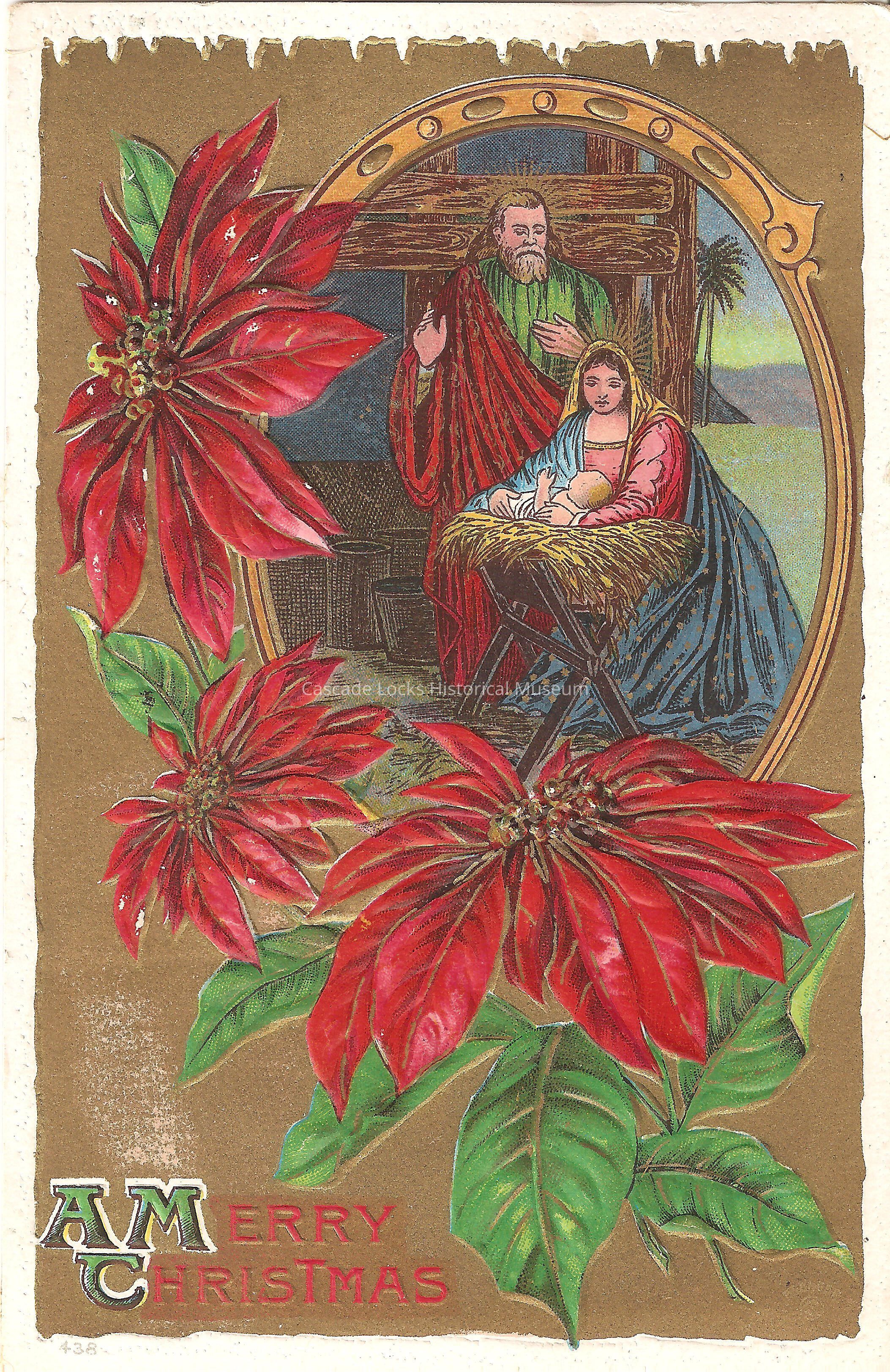 Post Card, illustrated image of a nativity scene. The boarder of card is gold with Poinsettias. Bottom of card reads, "A Merry Christmas."