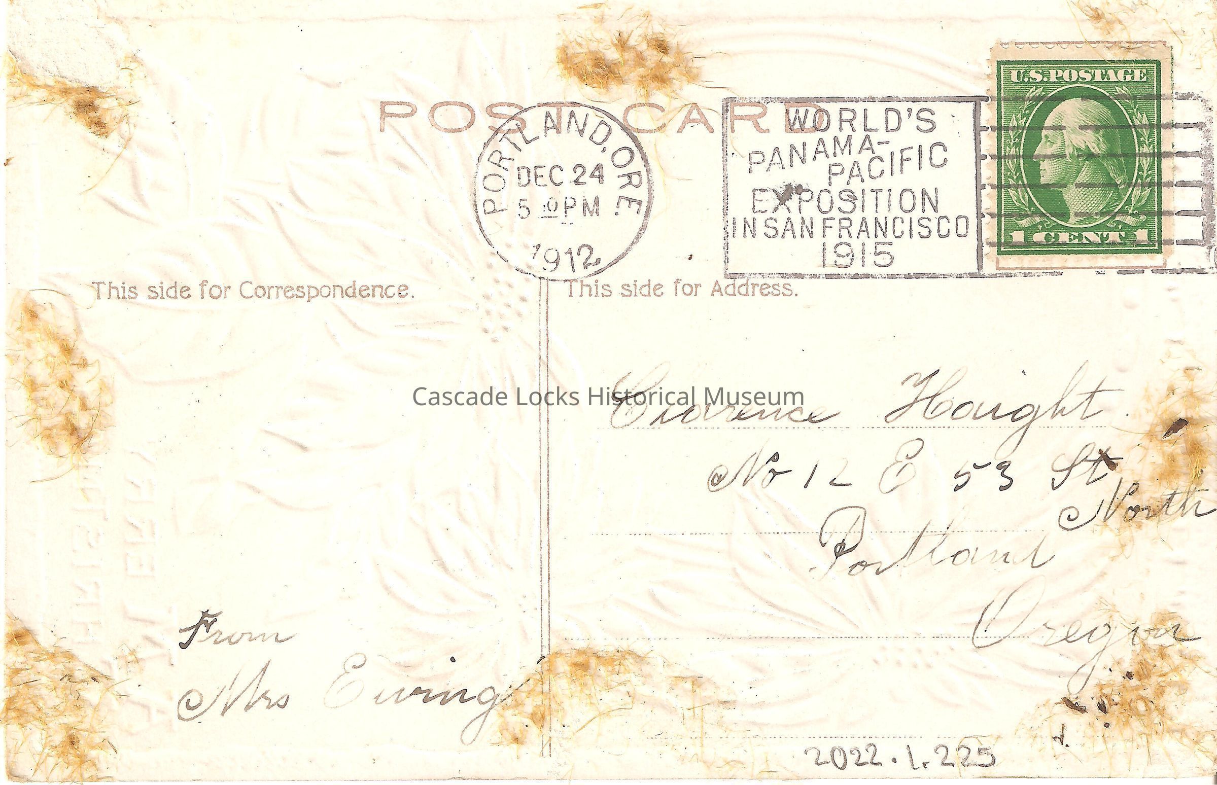 Back of image reads, "Post Card, This Side For Correspondence- From Mrs. Erving. This Side For Address- Clarence Haight, No. 12 E. 53rd St. North. Portland, Oregon. Portland, Ore. Dec 24, 5-PM, 1912. World's Panama Pacific Exposition in San Francisco 1915. U.S. Postage, 1 Cent."Lexicon