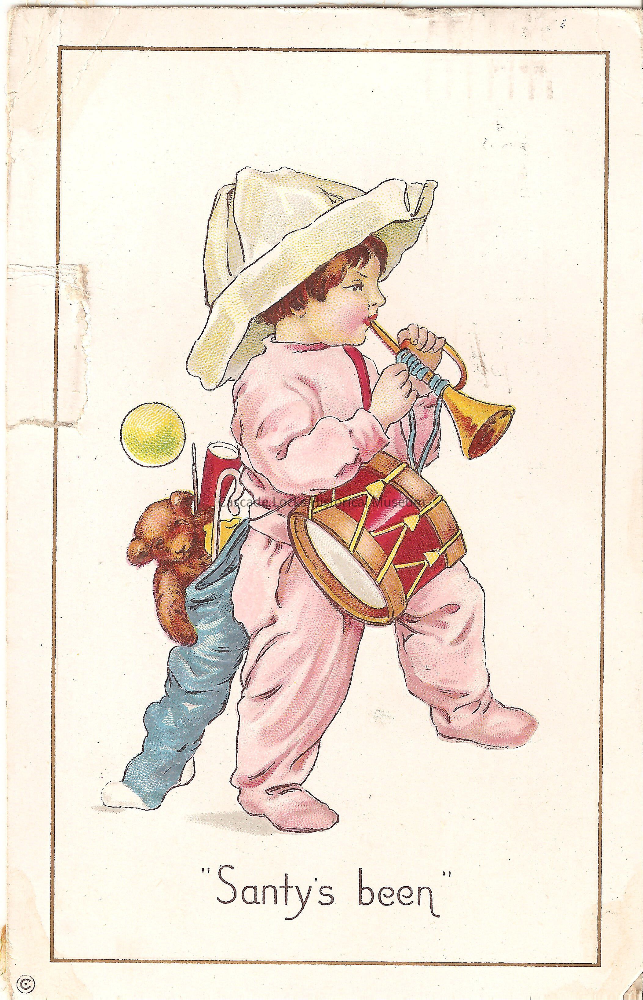 Post Card, illustrated image of a young child playing with two musical toys and pulling a stocking filled with toys. Below the child reads, "Santy's Been."
