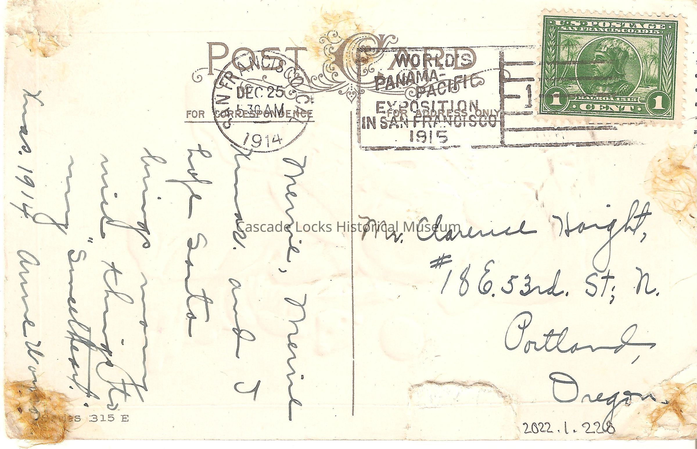 Back of image reads, "Post Card, For Correspondence- Merie, Merie Xmas and I hope Santa brings many nice things to my "sweetheart," Xmas 1914. Anne Wog- For Address Only- Mr. Clarence Haight #18 E. 53rd St. N. Portland, Oregon. Series 315 E. Fan Francisco Dec 25, 630-AM, 1914. Worlds Panama Pacific Exposition in San Francisco 1915. U.S. Postage San Francisco 1915, Balboa 1513. 1 Cent."Lexicon