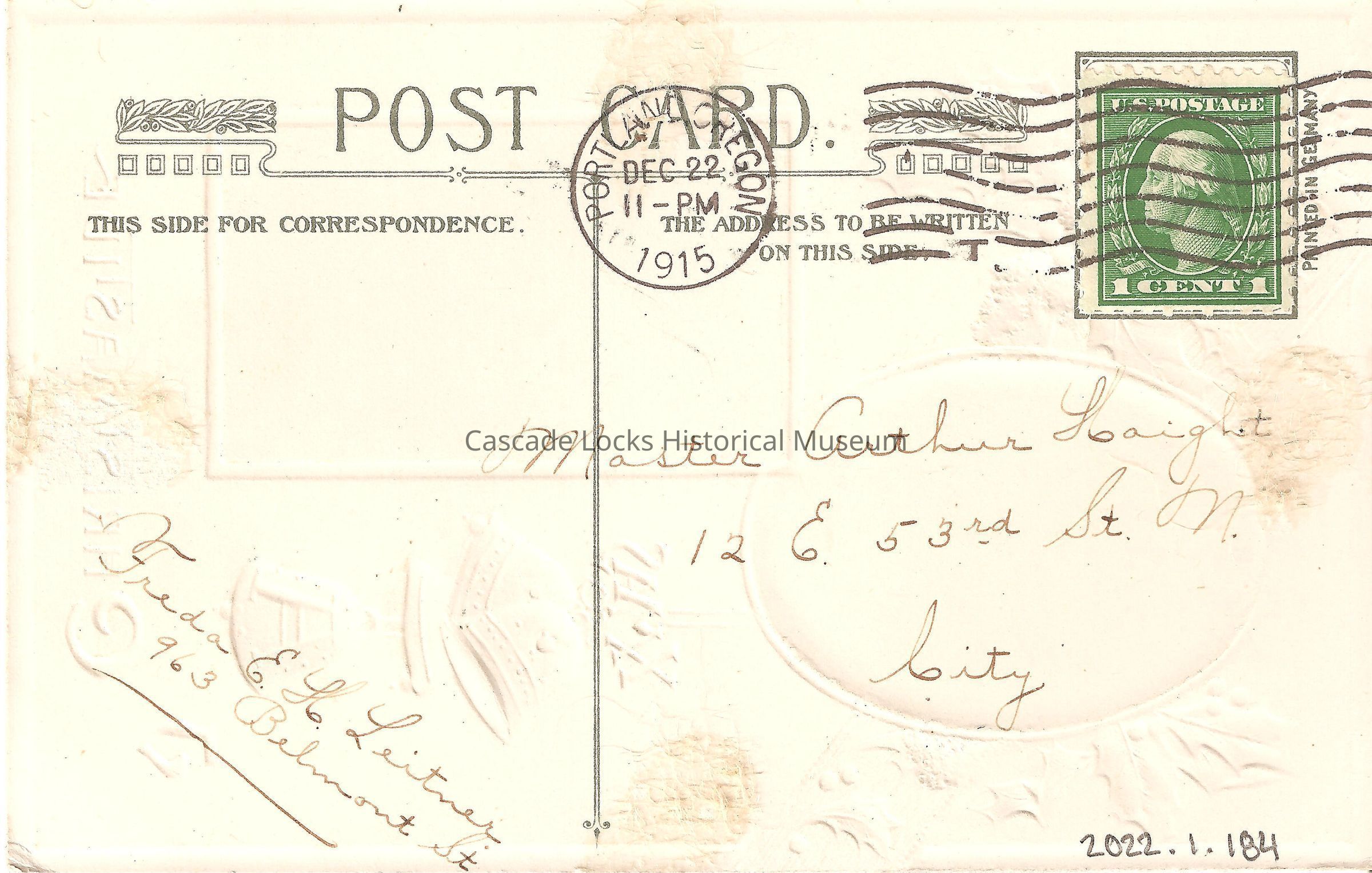 Back of image reads, "Post Card, This Side For Correspondence- Freda E. H. Leitner 963 Belmont St. The Address To Be Written On This Side- Master Clarence Haight, 12 E. 53rd St. N. City. U.S. Postage, 1 Cent. Portland, Oregon. Dec 22, 11PM, 1915. Printed in Germany."Lexicon