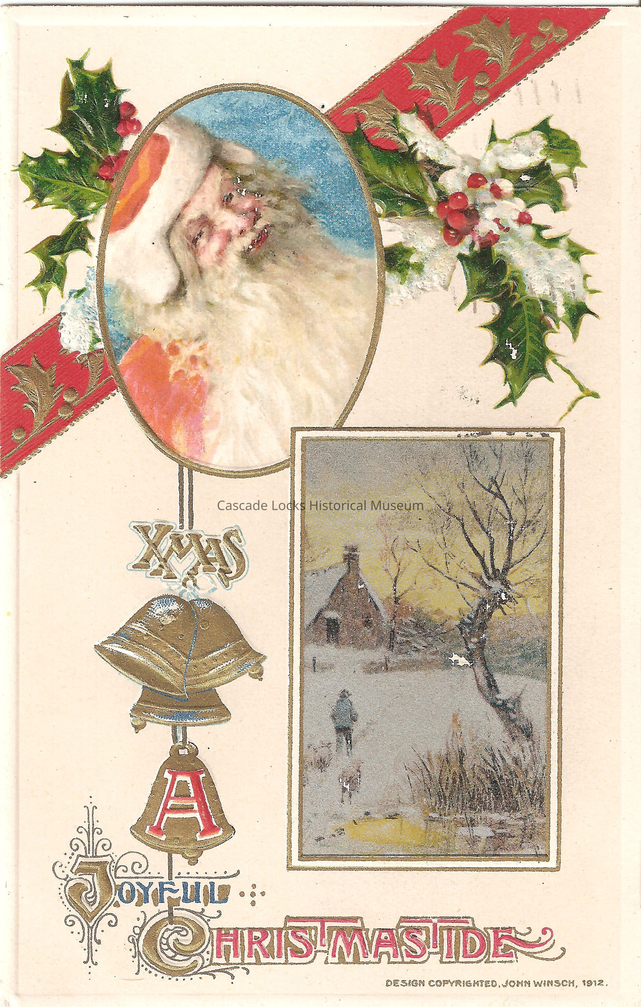 Post Card, illustrated image of Santa Claus in a portrait window and in another window below Santa Claus is an image of a snow-space. The boarder has holly and bells that read, "Xmas, A Joyful Christmastide. Design Copyrighted, John Winsh, 1912."