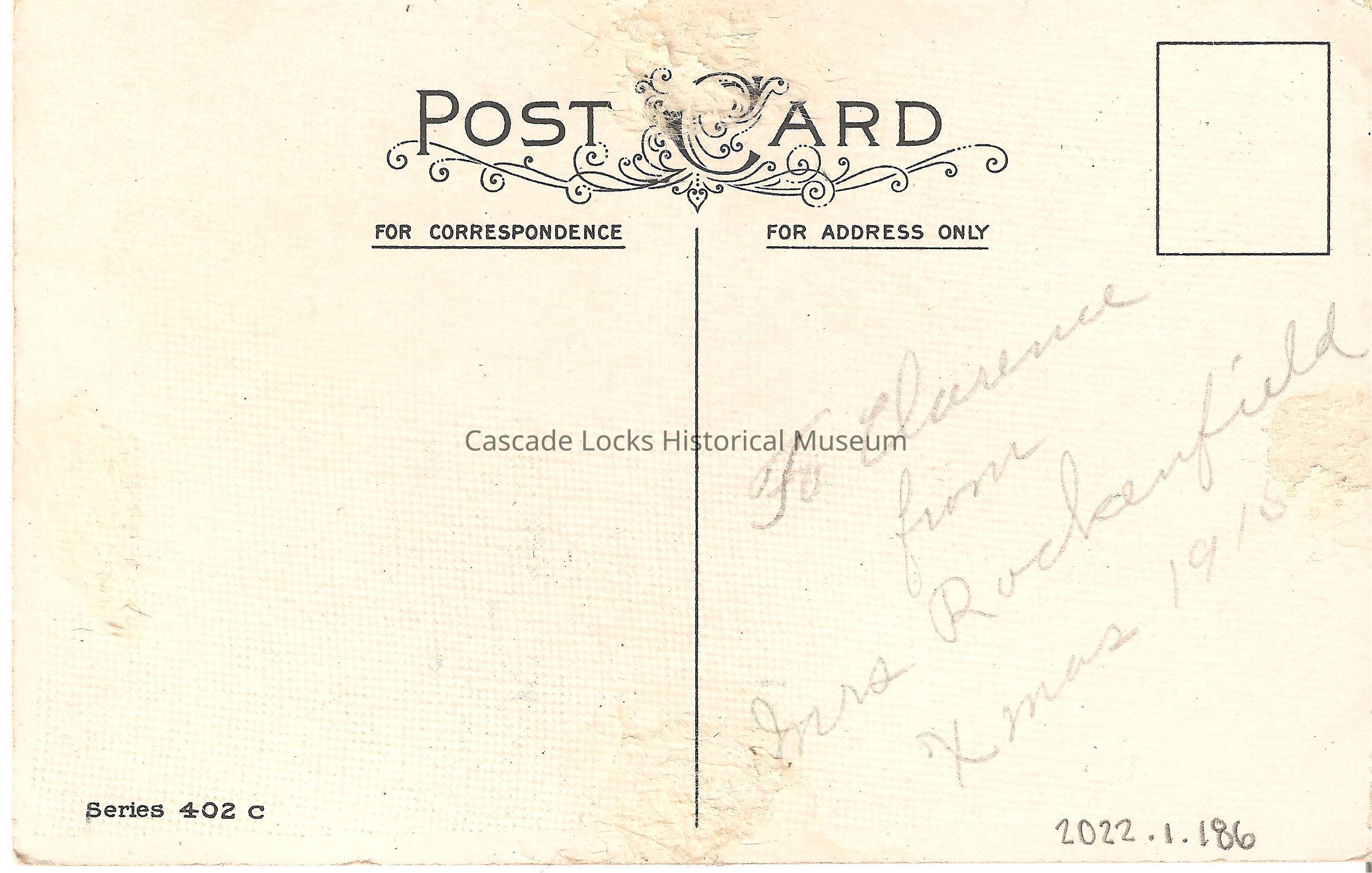 Back of image reads, "Post Card, For Correspondence- For Address Only- To Clarence From Mrs. Rockenfield Xmas, 1915. Series 402C."Lexicon