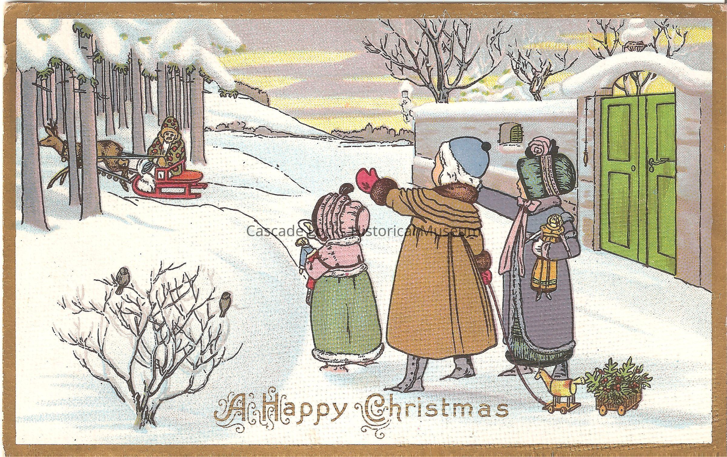 Post Card, illustrated image of three children waving to a person on a sleigh being pulled by a reindeer as they ride away. On the base of the card reads, "A Happy Christmas."