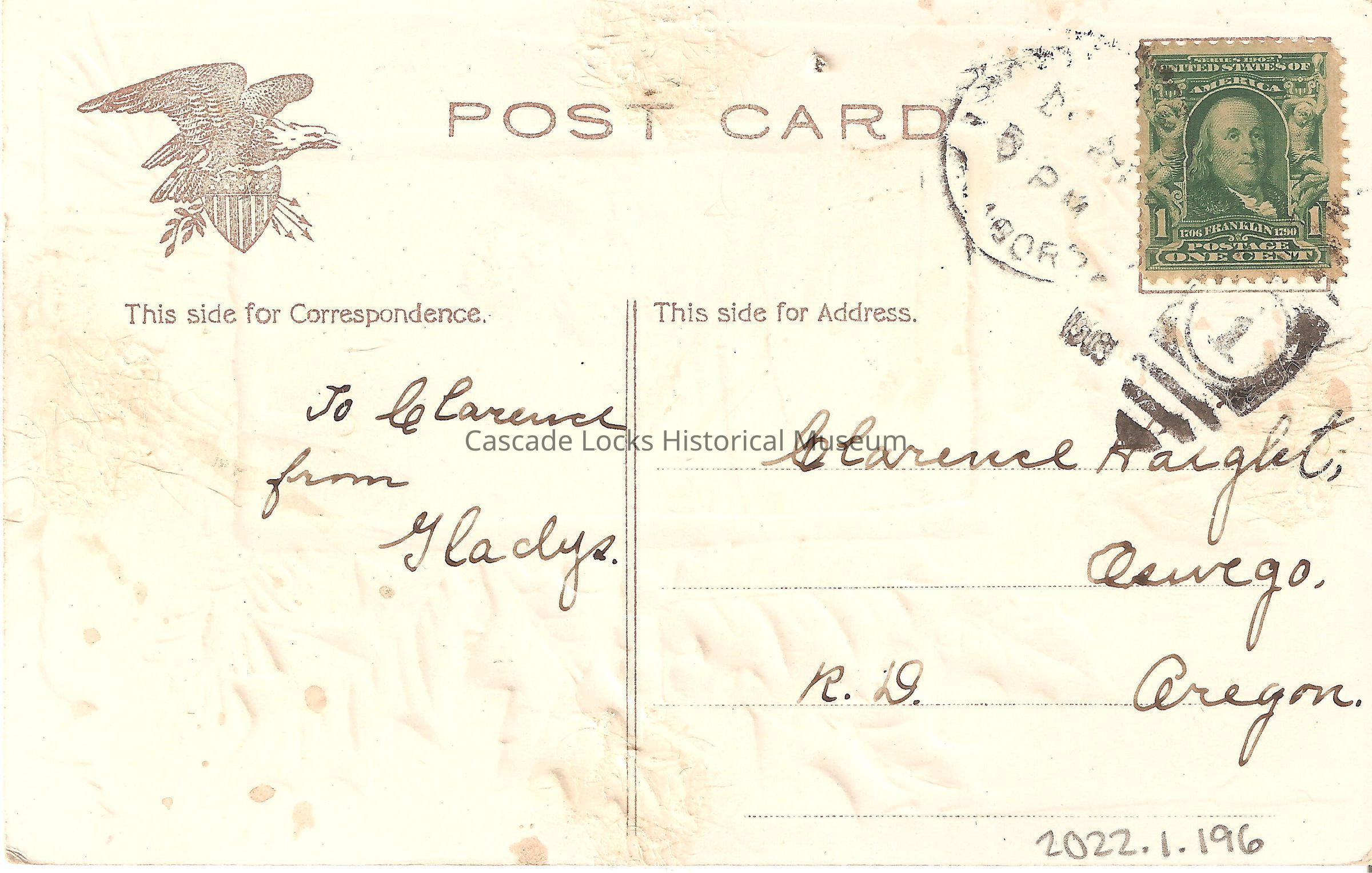 Back of image reads, "Post Card, For Correspondence- To Clarence from Gladys. For Address Only- Clarence Haight, Oswego, Oregon. R 19. United States of America 1706-1790 Franklin, Postage One Cent. Postmark stamp is to smeared and faded, 5PM can be made out but nothing further."Lexicon