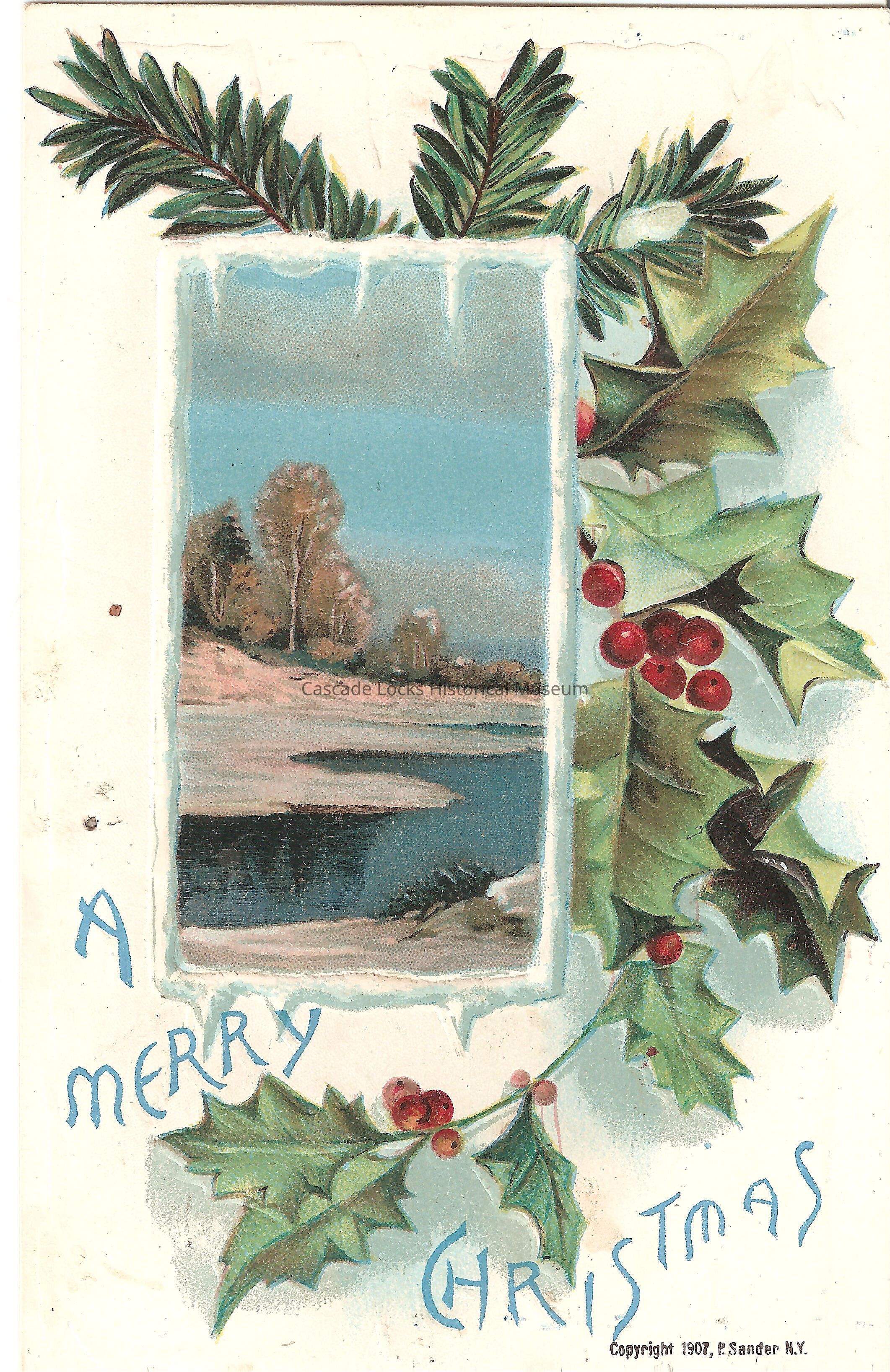 Post Card, illustrated image of a frozen river snow-scape with trees. Around the boarder is pine and holly branches. Base of card reads, "A Merry Christmas, Copywrite 1907, P. Sander, N.Y."
